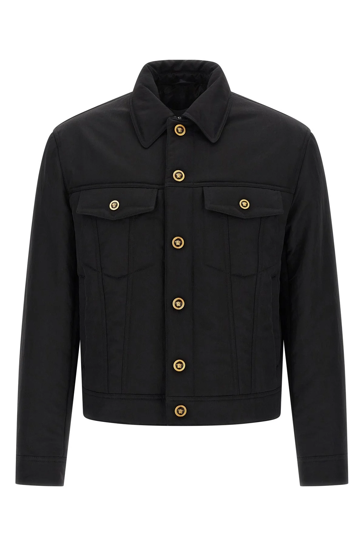 cod. 10222401A164501B000 Lightly padded nylon jacket, shirt collar, front metal 'Medusa' button closure, pockets, long cuffed sleeves, cupro lining. Color: Black Size & Fit: true to size fit Composition: 100% nylon Made in: Romania