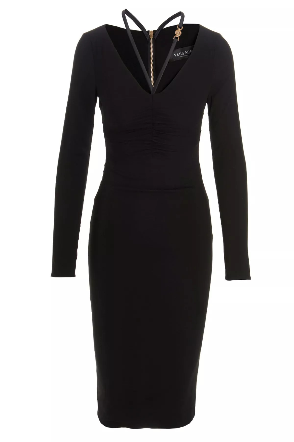 cod. 10063381A005231B000 Medusa' viscose midi dress with Medusa strap detailing on the neck, ruffles at the center, a v-neck, long sleeves and ruffles. Color: Black Size & Fit: True to size fit Composition: 92% viscose 8% elastane