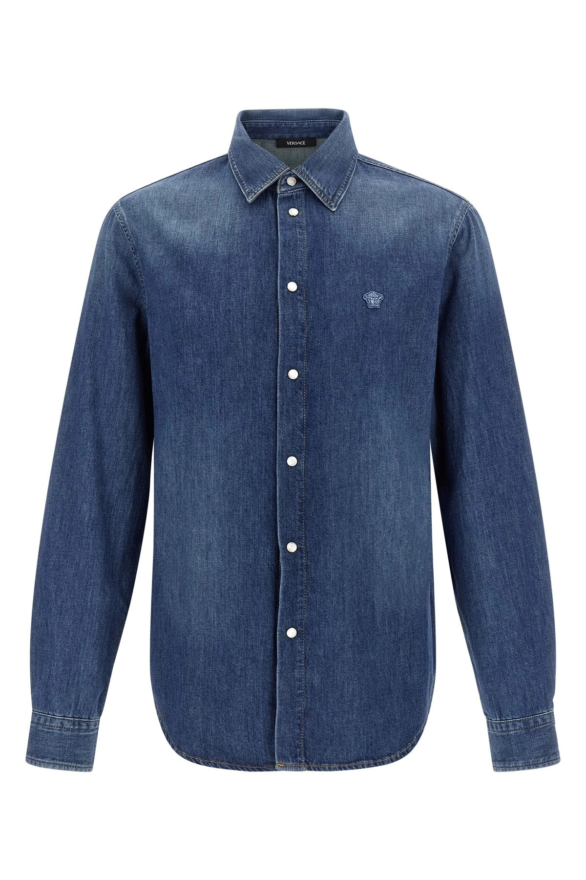 cod. 10207011A150221D030 Light cotton denim shirt with medium stonewashed treatment, 'Medusa' patch, front snap button closure, long cuffed sleeves. Color: Blue Size & Fit: true to size fit Composition: 100% cotton Made in: Tunisia