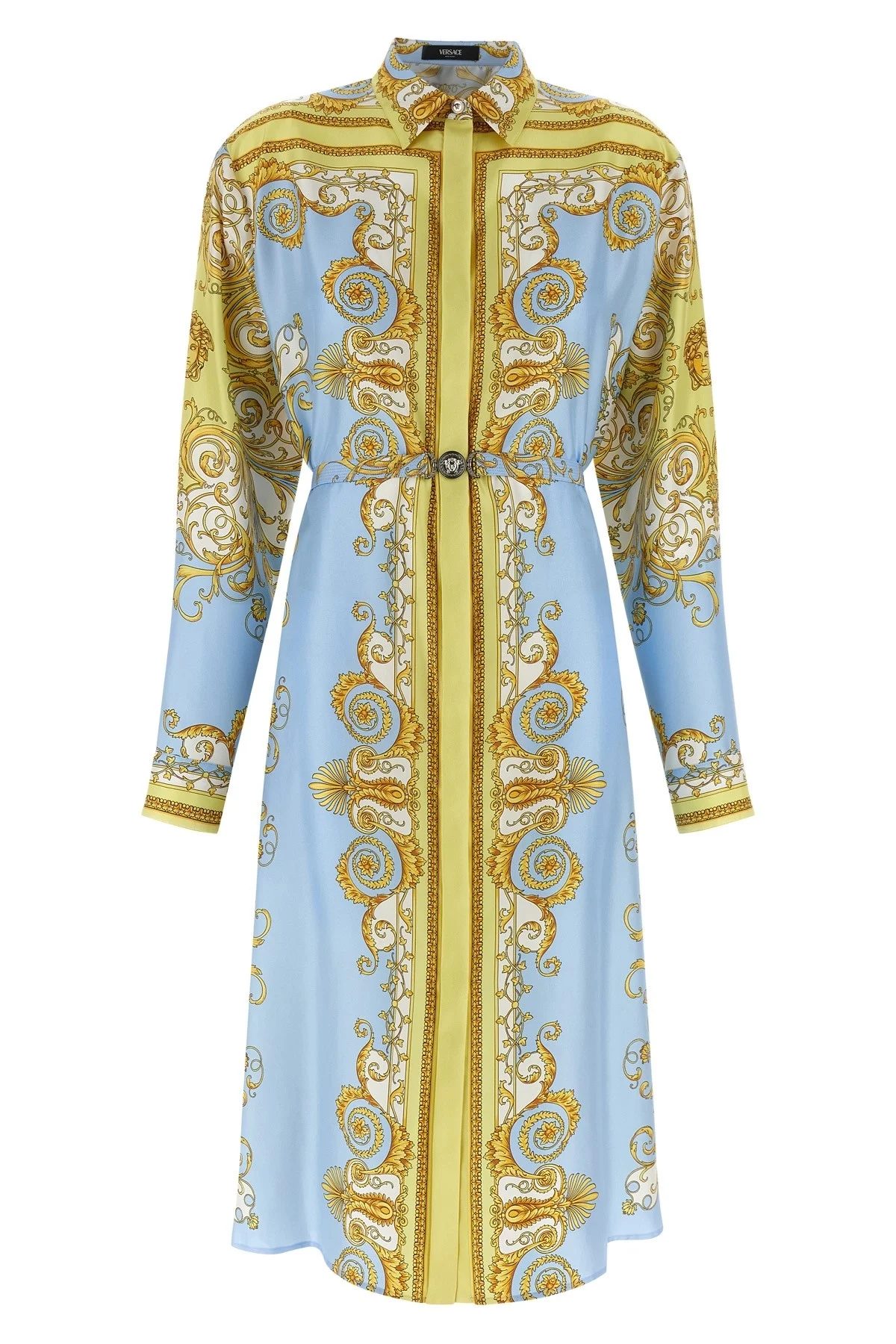 cod. 10186221A171655Y580 All over 'Spring Barocco' print silk twill midi dress with chemisier style, 'Medusa' button closure Concealed front, long cuffed sleeves, belt with removable metal 'Medusa '95' buckle. Color: Light Blue Size & Fit: true to size fit Composition: 100% silk Made in: Italy