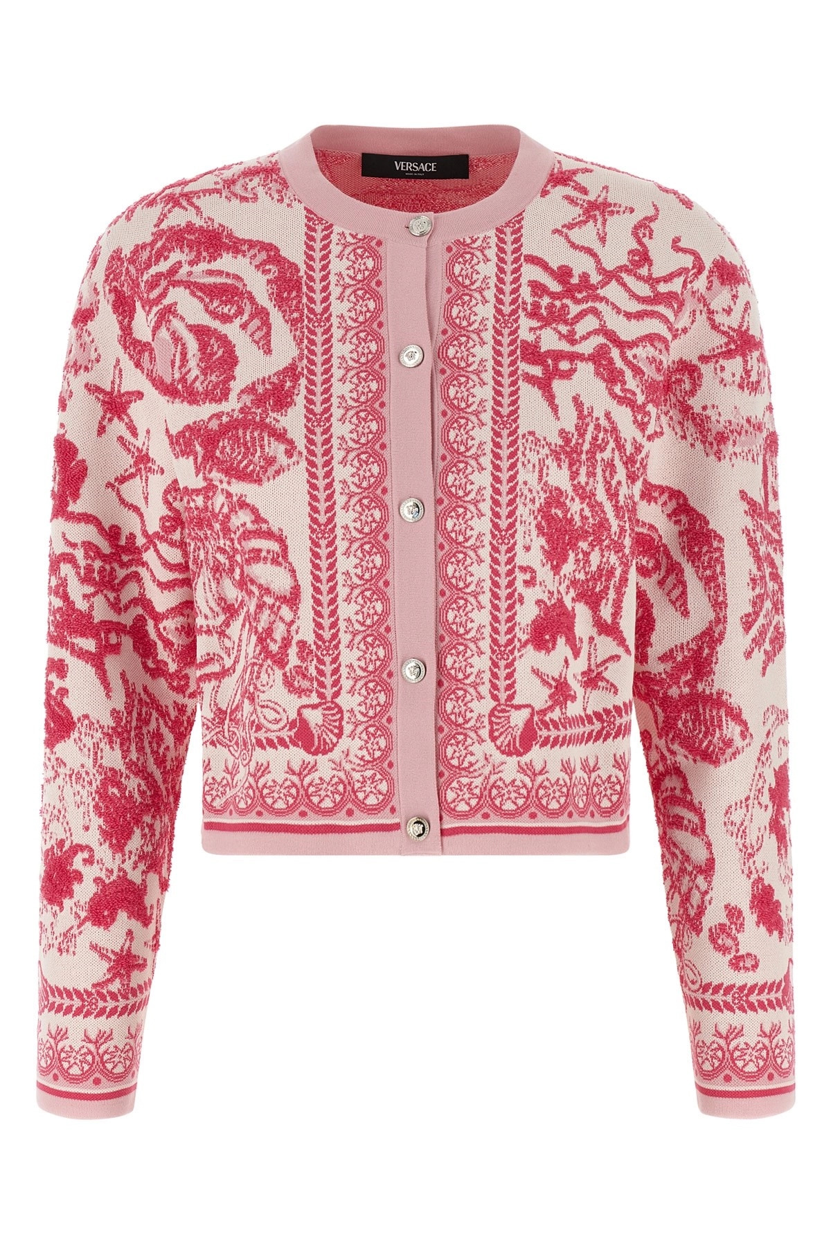 cod. 10208131A147322KS70 Stretch knit cardigan with terry stitch 'Underwater Barocco' pattern, crew neck, metal 'Medusa' button closure on the front, long sleeves. Color: Pink Size & Fit: true to size fit Composition: 68% co, 26% vi, 6% pl Made in: Italy