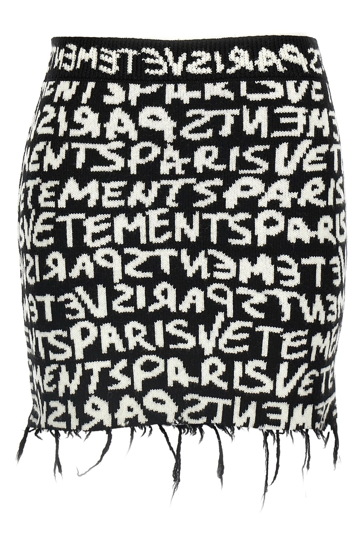 cod. WA65KN312BBLACKWHITE Vetements Paris Monogram Mini' wool knit skirt with all-over jacquard logo, elastic waistband, frayed hem. Color: White/Black Size & Fit: true to size fit Composition: 100% merino wool Made in: Italy