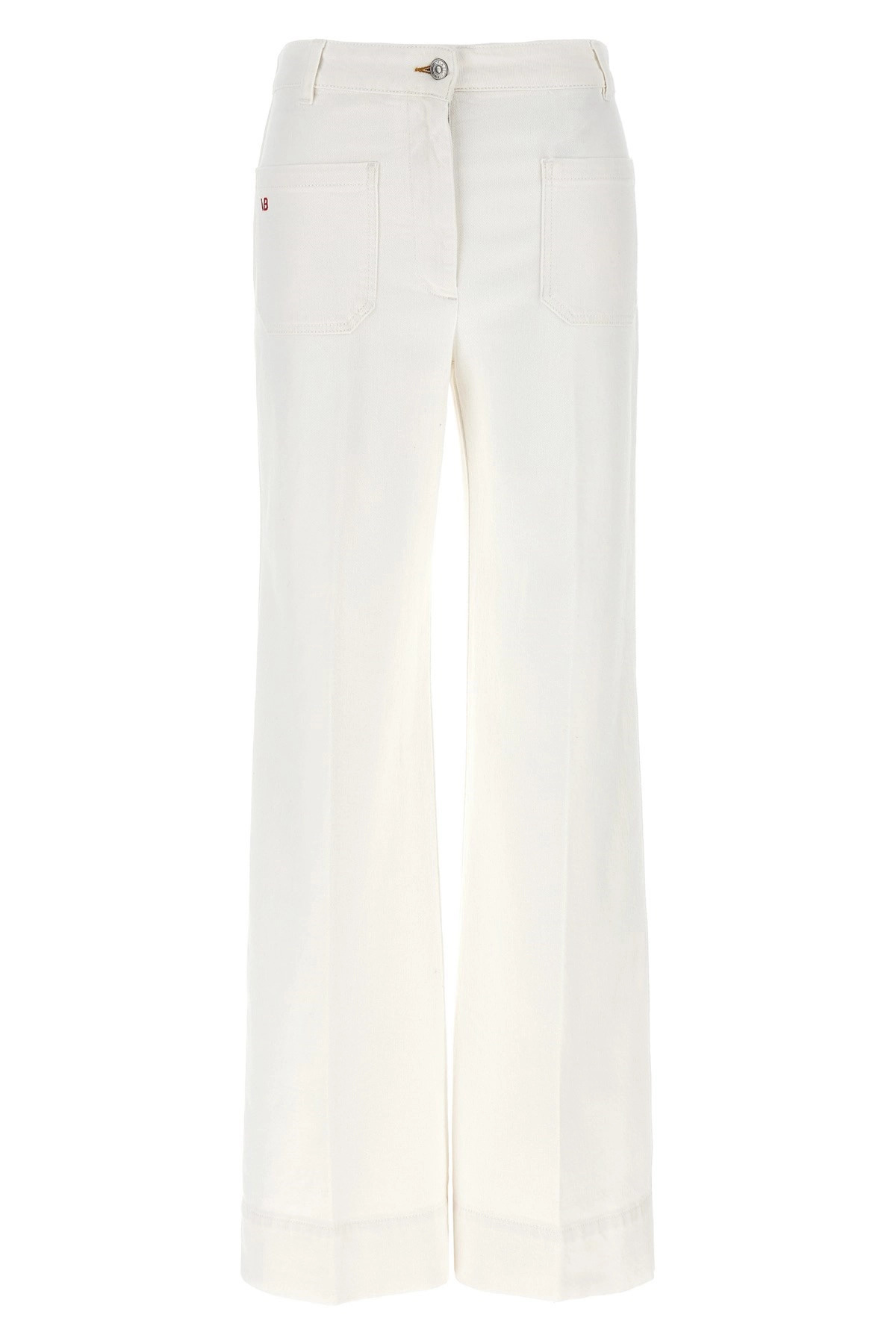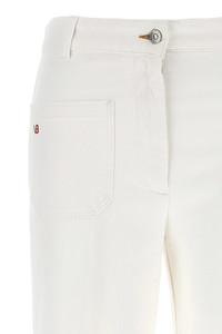 cod. 1325DJE005218TRWASHEDWHITE 'Alina' cotton denim jeans with front logo embroidery, zip and button closure, pockets, high waist style with wide straight leg, back leather logo tag. Color: White Size & Fit: True to size fit Composition: 98% cotton, 2% elastane Made in: Italy