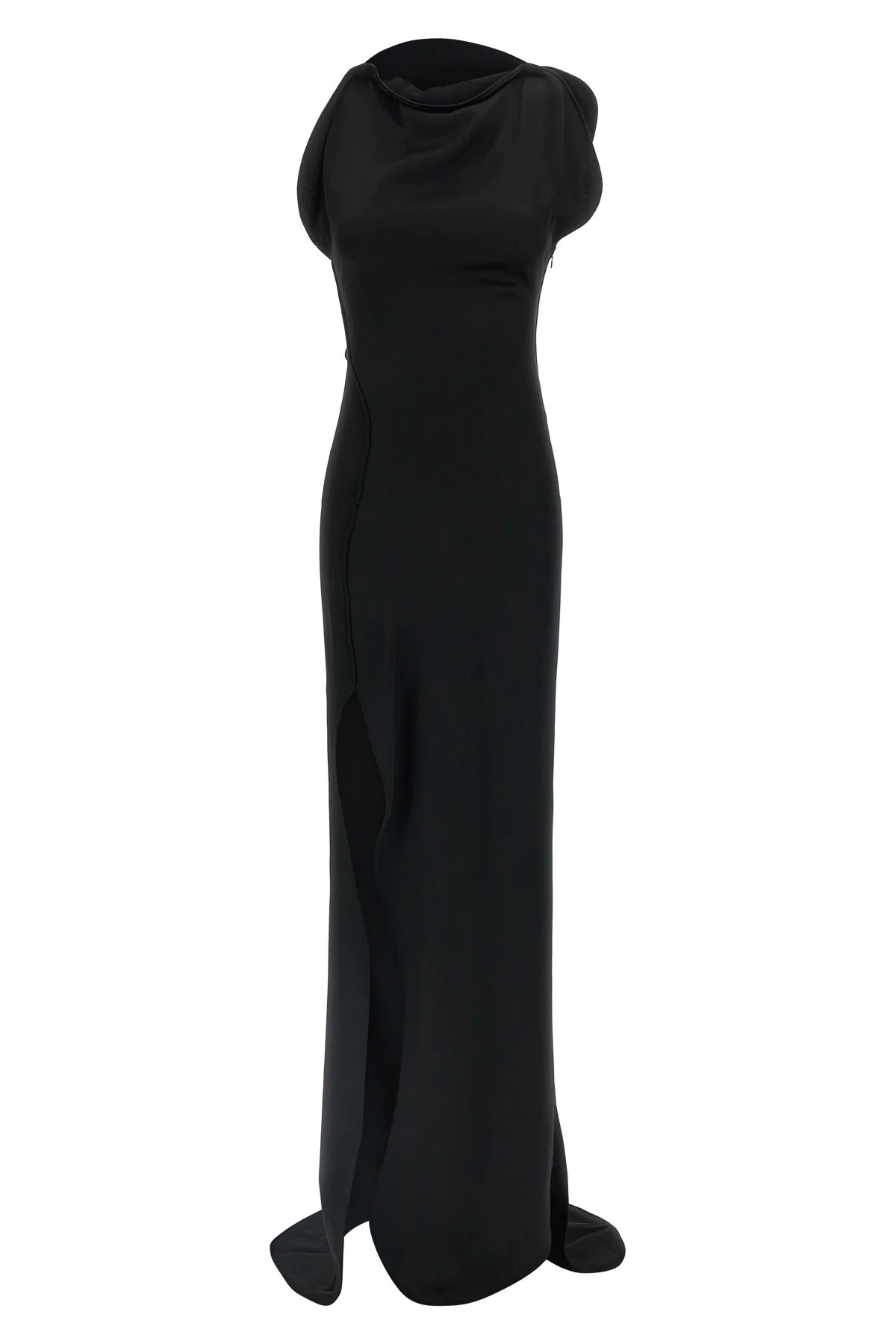 cod. 1425WDR007008ABLACK Long 'Carla' dress in satin crepe, asymmetrical neckline with draping and piping in the hem, tight fit, light back train, back closure with hidden zip. Color: Black Size & Fit: True to size fit UK sizing Composition: 71% acetate, 29% viscose Made in: Portugal