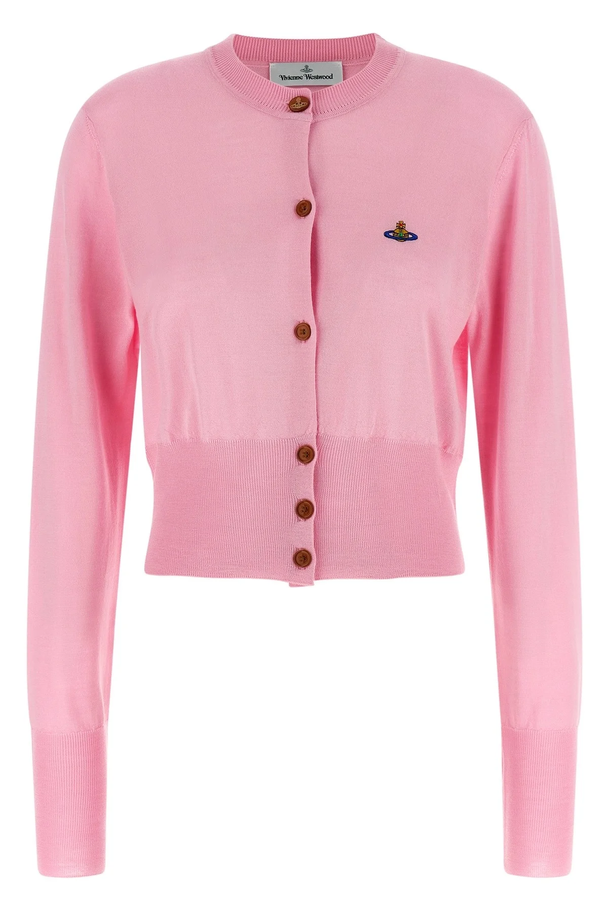 cod. 1803002UY001AG401 'Bea' cropped wool and silk cardigan with Orb logo embroidery and front button closure, round neckline, long cuffed sleeves. Color: Pink Size & Fit: true to size fit Composition: 70% wool, 30% silk Made in: Italy