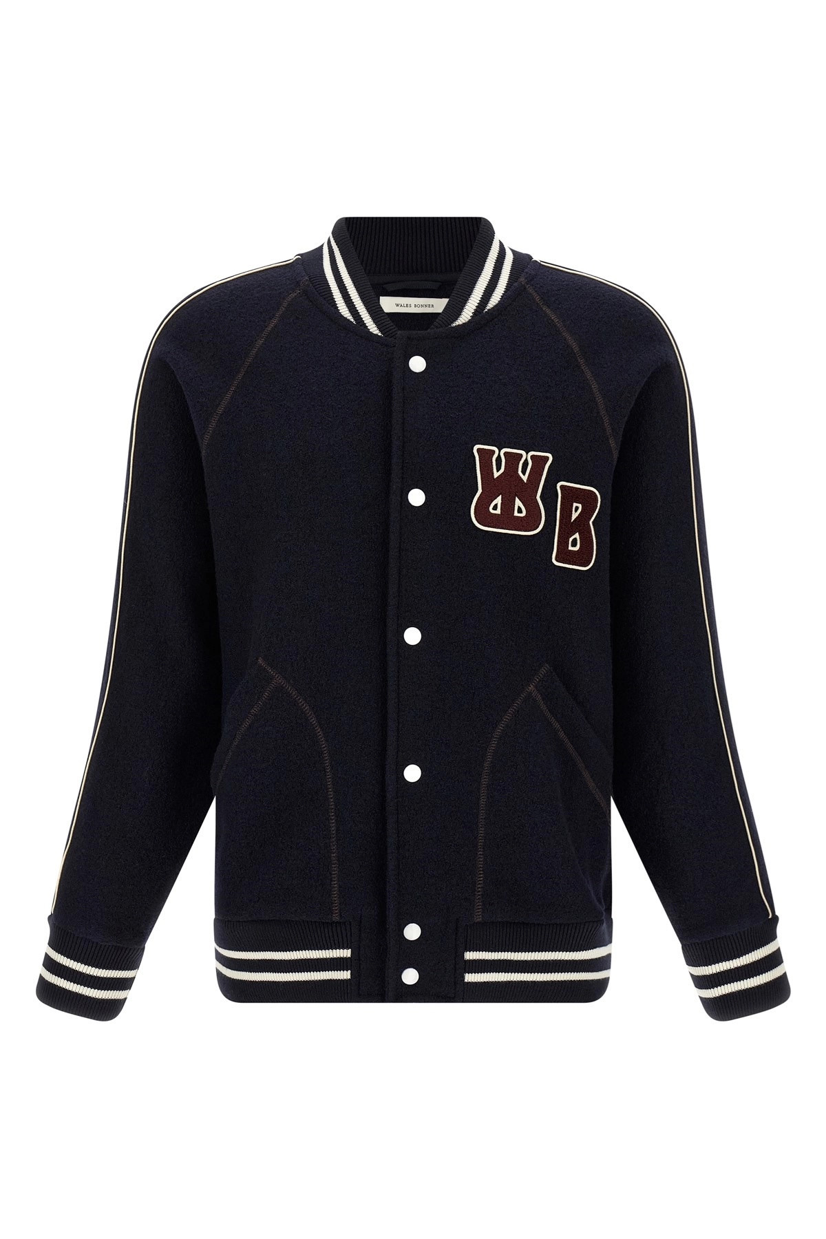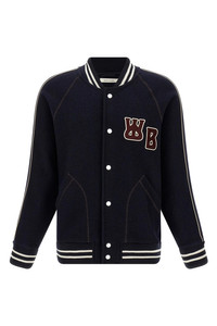 cod. MA25JE18JE04503 'The October Varsity' boiled wool bomber jacket with stretch ribbed knit details, terry cloth logo patch and front snap button closure, pockets, long cuffed sleeves, unlined. Color: Blue Size & Fit: Relaxed fit Composition: 100% virgin wool Made in: Portugal