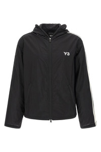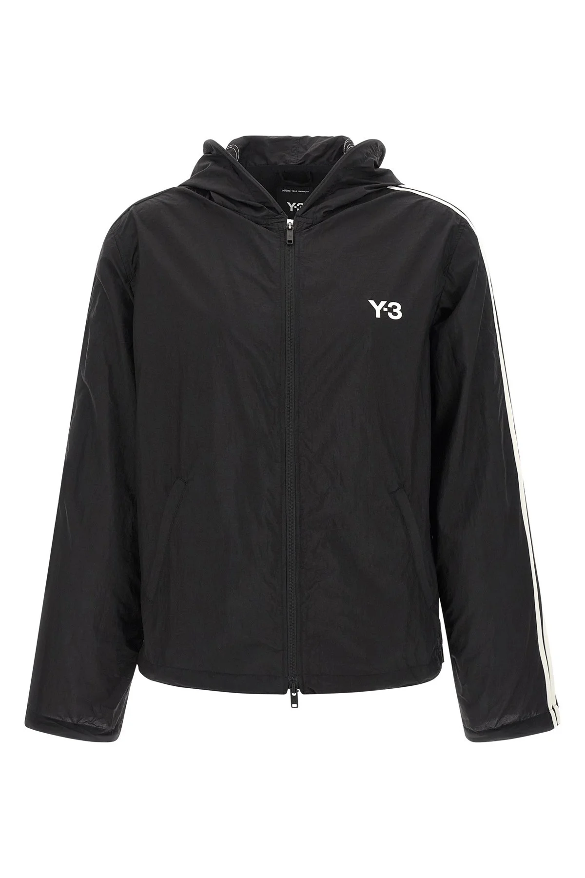cod. KF1085BLACK Tech fabric hoodie with 'Y-3' logo print and front zip closure, pockets, long sleeves with iconic 3 contrast stripes and wire on the sleeve hem, drawstring on the hem, unlined. Color: Black Size & Fit: Relaxed fit Composition: 100% polyamide Made in: Vietnam