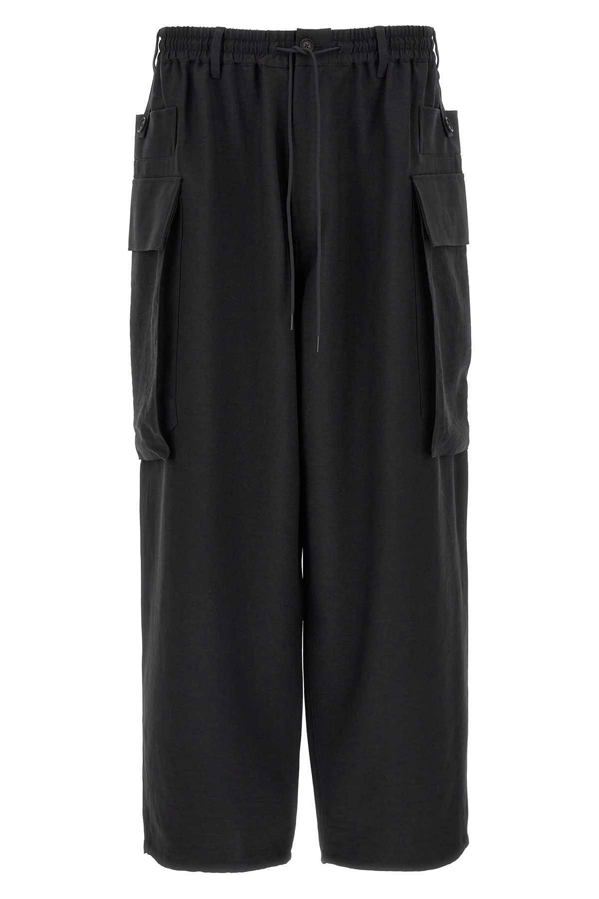 cod. JN4908BLACK 'Y-3 Sport Uniform Cargo' low-waisted pants in polyester twill, wide leg with cargo pockets, adjustable drawstring elastic at the waist, zip and button closure, pockets. Color: Black Size & Fit: true to size fit Composition: 100% polyester Made in: China