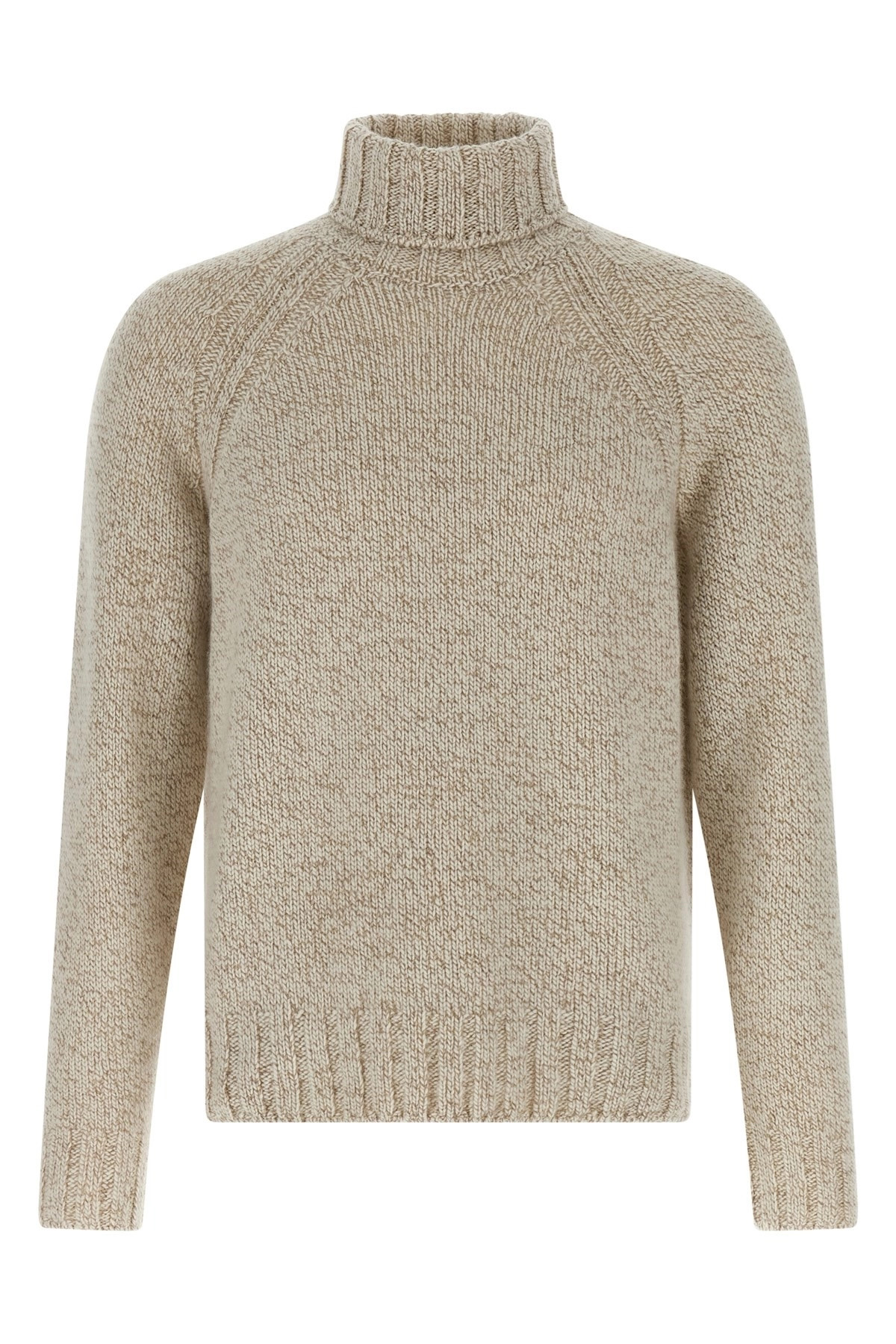cod. UGB30A2320900001 Knitted cashmere and wool blend turtleneck sweater in cashmere and wool blend with turned-up, long cuffed sleeves. Color: Beige Size & Fit: true to size fit Composition: 86% cashmere 14% wool Made in: Italy