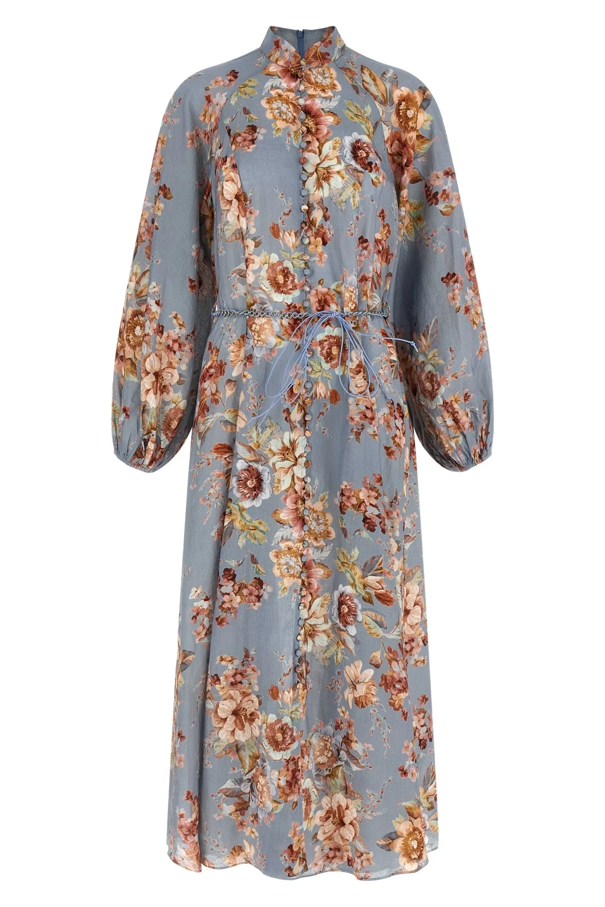 cod. 2354DRS261CFLR Long 'Awaken' floral print linen dress with flared silhouette, high neck, front button closure, long puff sleeves with elastic cuffs, back zip closure, removable belt. Color: Light Blue Size & Fit: true to size fit Composition: 100% linen Made in: China