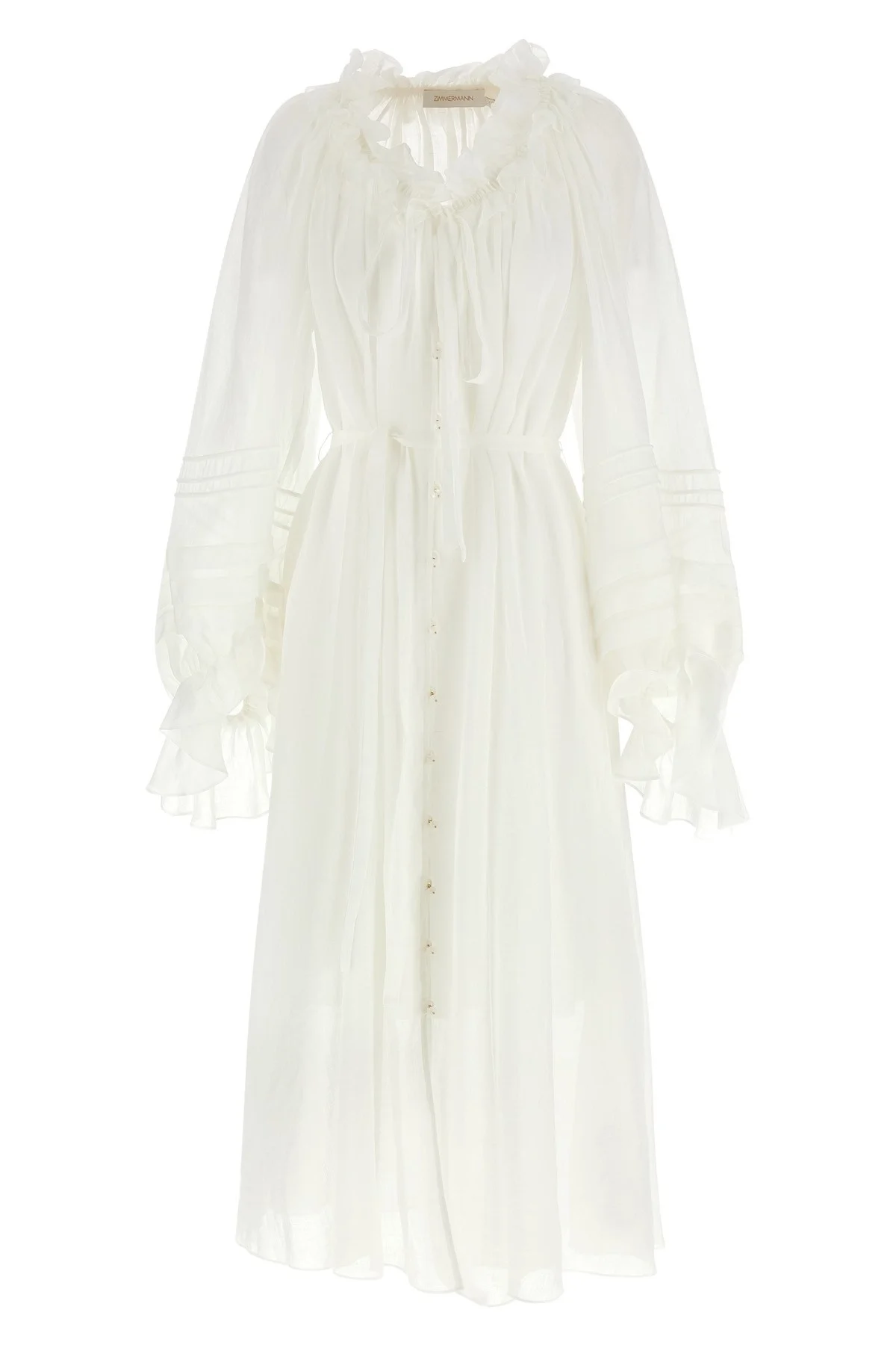 cod. 6930DC261IVO Long ramie Billow Rebellion dress, ruffle collar finished with lavalliere with ruffles around the neck and asymmetric hem, front button closure, long puff sleeves with elastic cuffs, removable belt, removable petticoat. Twisted Romance Collection Color: White Size & Fit: true to size fit Composition: 100% ramie Made in: China