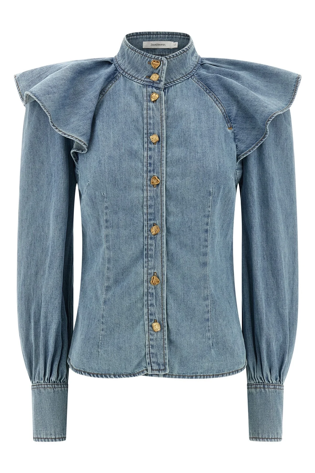 cod. 2322TR251BLUMOON 'Crush Denim' cotton denim blouse with contrast stitching, high neck, front heart-shaped metal button closure, shoulder ruffles, long cuffed sleeves, rounded hem. Color: Blue Size & Fit: true to size fit Composition: 100% cotton Made in: China
