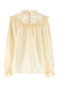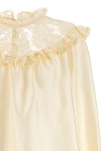 cod. 5070TF25RCRM 'Lace Billow' silk blouse with ruffled lace top, high neck, back zip closure, long puff sleeves with elastic ruffle cuffs. Color: Beige Size & Fit: Comfort fit Composition: 100% silk Made in: Vietnam