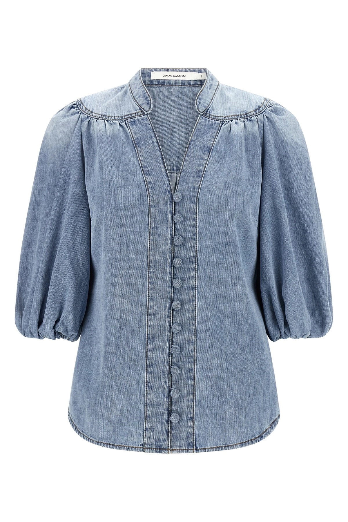 cod. 2867TSS252SKYLK 'Lucky' cotton denim blouse with V-neck with Korean collar, front button closure, ruffled shoulders, 3/4 balloon sleeves. Color: Light Blue Size & Fit: True to size fit Composition: 100% cotton Made in: China
