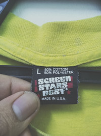 DESCRIPTION SIZE ON TAG : L FIT TO M TAG: SCREEN STARS BEST CONDITION : GOOD USED.8/10.HAS A FEW STAINS ON SHIRT.PLEASE REFER PHOTO. PIT TO PIT: 20.5 INCH LENGTH : 28.5 INCH MATERIALS: COTTON AND POLYESTER IMPORTANT !!!!!!!!!!!!!!!!!!!! (!) I AM THE POSSIBILITY OF HUMAN COMMON FORGET SOMETHING TOLD THERE. WE TRY TO TELL ABOUT THE ITEM OF DETAILED. PLEASE LET I KNOW IF U HAS DOUBTFUL ON DESCRIPTION MY ITEM I TRY TO SOLVE IT…. (!!) I SELL USED ITEMS / PREOWNED POSSIBLE EFFECTS ARE DIRTY, BLEACHED, TORN DO NOT ASSUME ITEM IS NEW AND NO DEFECTS. PLEASE READ DESCRIPTION BEFORE PURCHASE.