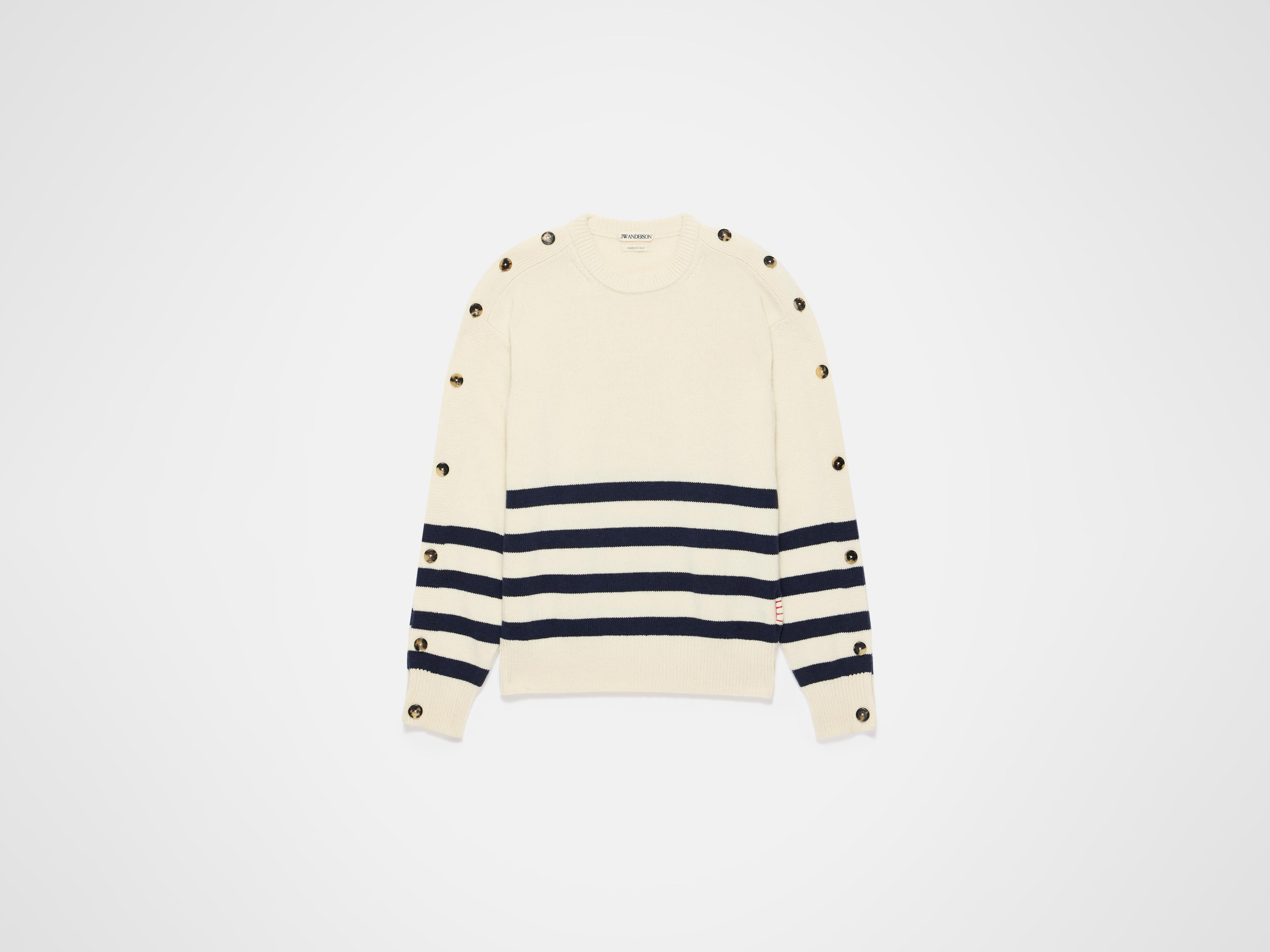 Buttoned sleeve breton crew neck jumper in ivory breton stripe, with rib trims and horn button openings. Details - Colour: Ivory - Composition [Main]: 100% Wool - Made in: Italy - Model [Wears]: Size M, 175cm Tall - SKU: KW1526YN0456006