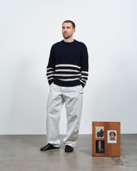 Buttoned sleeve breton crew neck jumper in navy engineered breton stripe with rib trims and horn button openings. Details - Colour: Navy - Composition [Main]: 100% Wool - Made in: Italy - Model [Wears]: Size S, 189cm Tall - SKU: KW1425YN0456888
