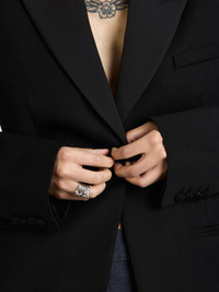 Tailored in Italy with hand-finished detailing, this jacket features a silk grosgrain lapel, wool undercollar, and fully lined construction. Built with specially selected shoulder pads and internal canvas, and finished with self-covered tailoring buttons. Details - Colour: Black - Composition [Main]: 100% Wool - Composition [Contrast]: 100% Silk - Composition [Lining]: 100% Cupro - Made in: Italy - Model [Wears]: Size 8, 180cm Tall - SKU: JK0403PG1883999