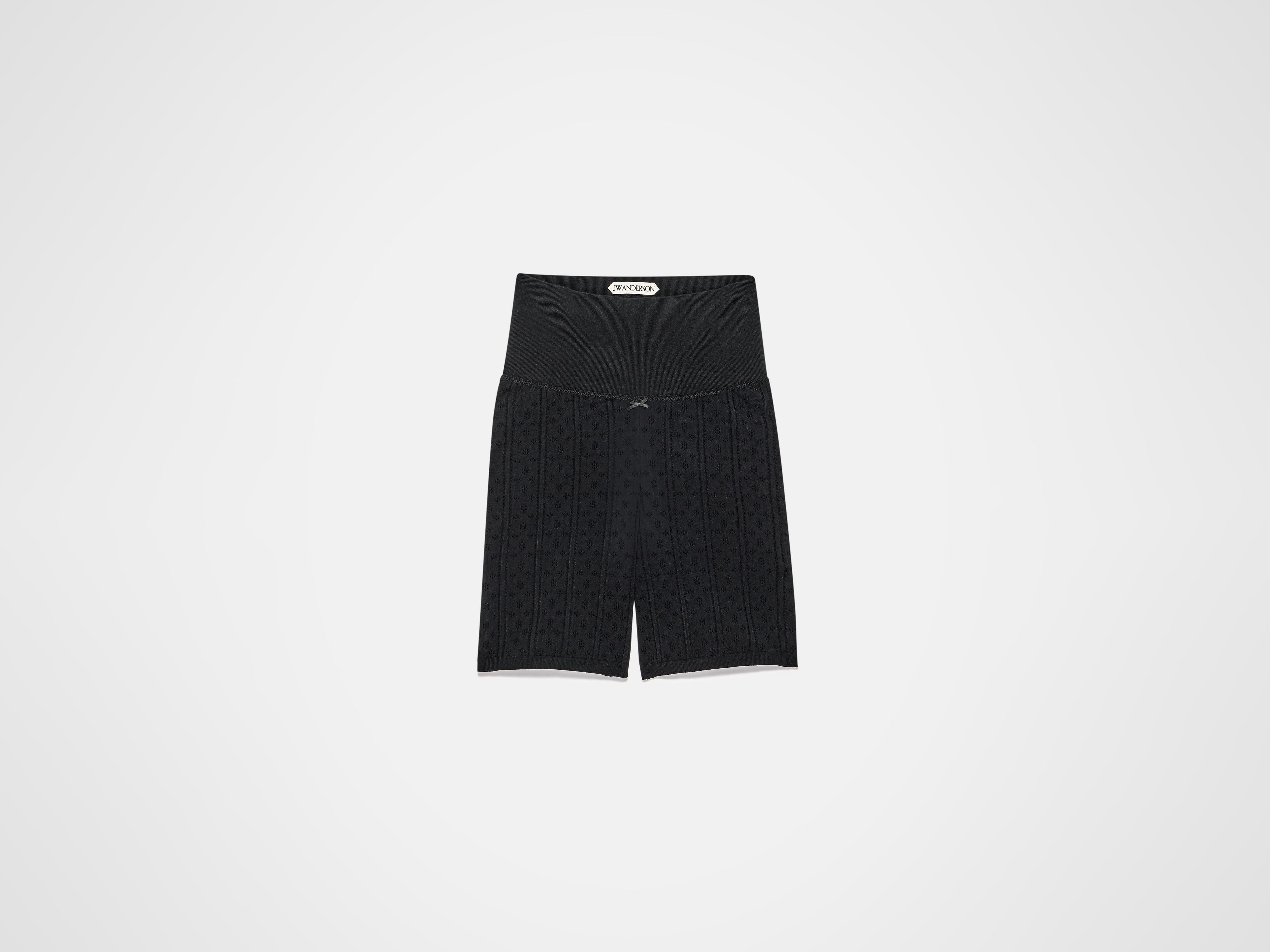 Knitted pointelle cycle shorts in black technical stretch viscose knit. Features a wide, soft knitted elastic waistband finished with a bow detail. Details - Colour: Black - Composition [Main]: 66% Viscose, 19% Polyamide, 13% Polyester, 2% Elastane - Made in: China - Model [Wears]: Size S, 178cm Tall - SKU: KW1475YN0309999