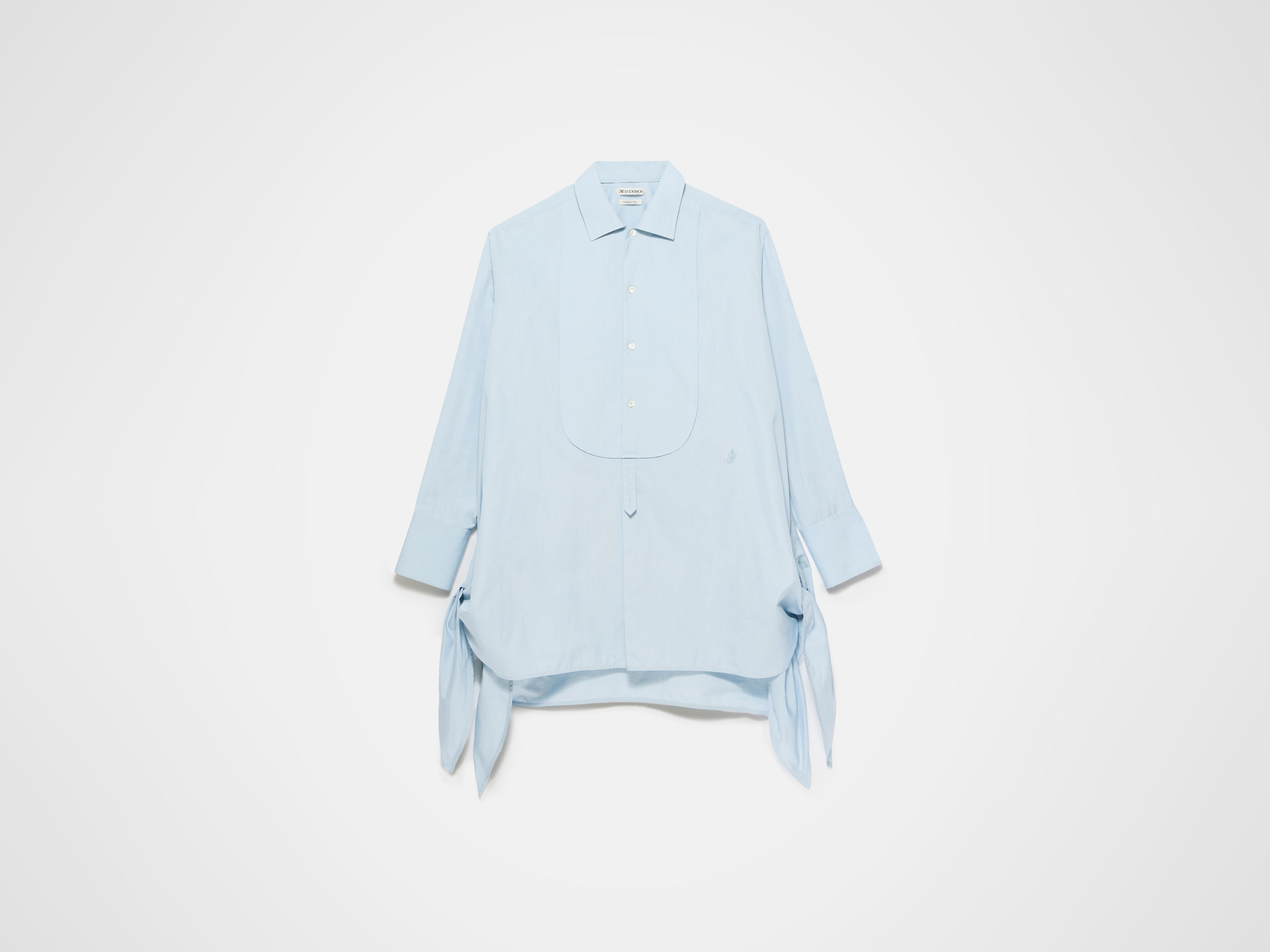 Knotted detail shirt dress in the finest powder blue Sea Island cotton and silk poplin. Features a soft feminine collar and self-fabric bib detail, finished with tonal anchor embroidery, loafer stitch on the cuff placket, and mother-of-pearl buttons. Details - Colour: Powder Blue - Composition [Main]: 89% Cotton, 11% Silk - Made in: Italy - Model [Wears]: Size 8, 180cm Tall - SKU: DR0500PG1894805