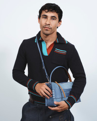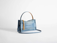 Crafted in Italy. The Loafer Bag in mid-blue Japanese denim with a calf leather base, strap and front band. The signature silhouette, a compact handbag with a top handle and adjustable crossbody strap. Features a wide zip opening, vegetable-tanned leather detailing, silver-finish hardware, and removable adjustable cross-body strap. Suede-lined with internal leather pocket. With denim crafted in Hiroshima, Japan, developed in collaboration with expert Japanese denim makers. Every detail is carefully considered. The penny keeper, sewn by hand with box stitches, wrapping over four times, reminiscent of the shoe itself. The base mimics the sole of a loafer, stitching details reflect the welt of a shoe. Precisely cut, edge-painted and logo embossed leather is meticulously assembled, for a seamless fit. A study in elevated craftsmanship, grounded in function. Details - Colour: Mid Blue Denim - Composition [Main]: 80% Cotton, 20% Full Grain Calf Leather - Composition [Lining]: 100% Split Grain Calf Leather - Composition [Hardware]: 100% Zamak - Measurements: [H] 17cm | [L] 29cm | [W] 8cm - Made in: Italy - SKU: HB0716FA0495844