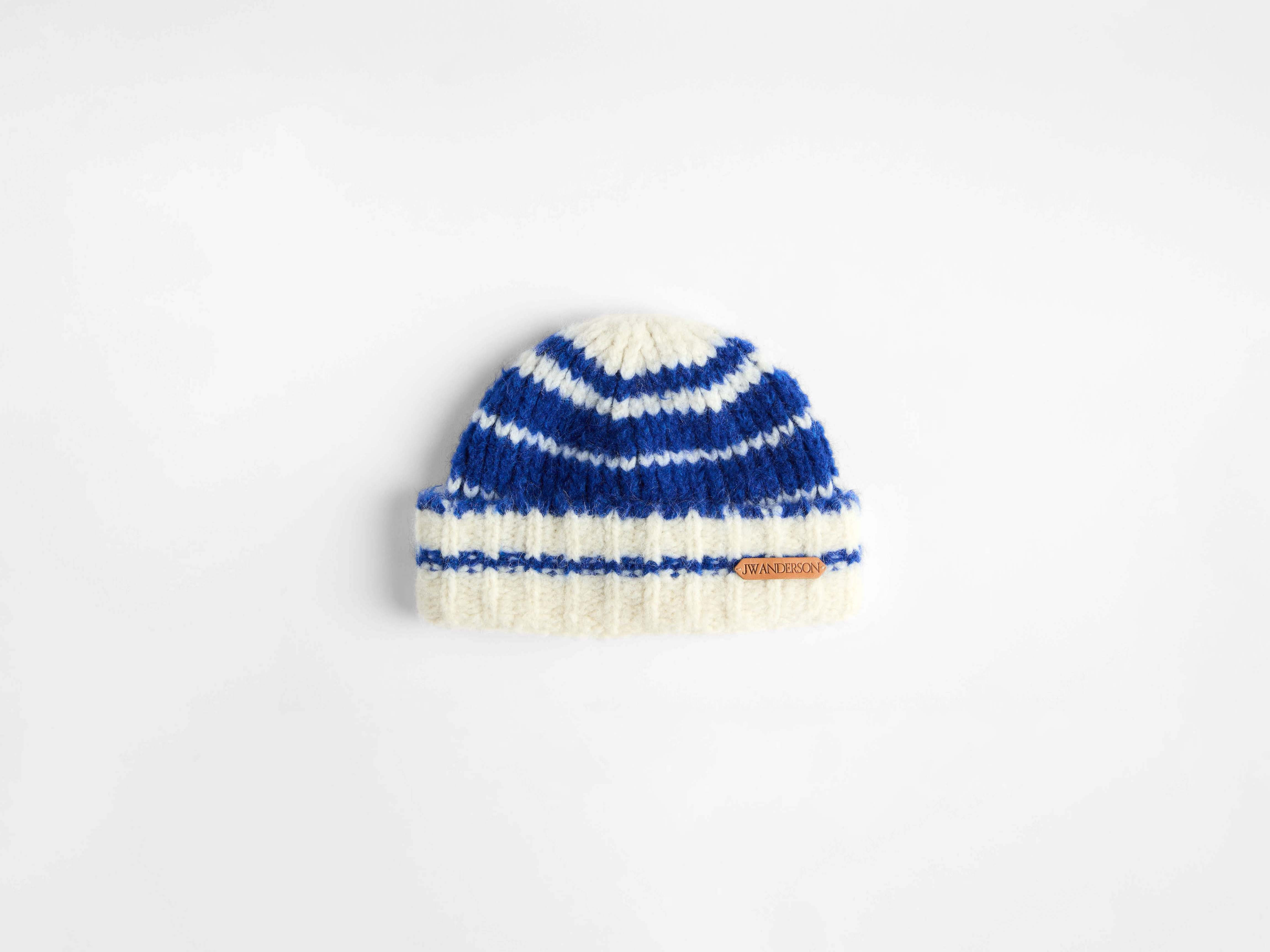 Striped beanie hat in royal blue striped mohair. Features a fold back, finished with an external leather logo patch. Details - Colour: Royal Blue - Composition [Main]: 61% Alpaca, 39% Polyamide - Made in: Italy - SKU: KW1458YN0493855