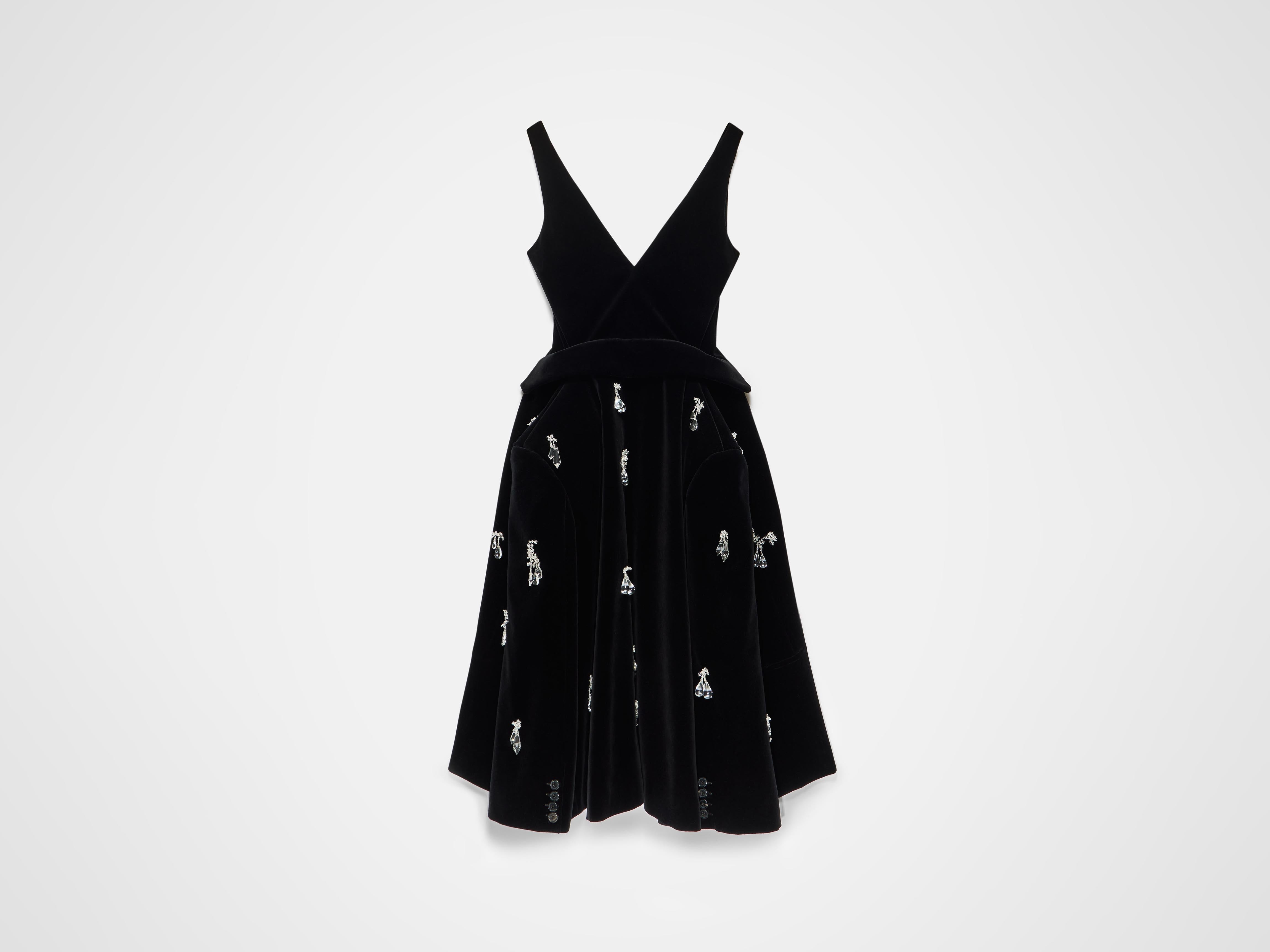 Structured dress in black velvet. Features a fully lined construction, sculpted from a traditional tailored jacket. Finished with chandelier crystal detailing and horn buttons. Details - Colour: Black - Composition [Main]: 100% Cotton - Composition [Lining]: 100% Cupro - Made in: Italy - Model [Wears]: Size 6, 180cm Tall - SKU: DR0525PG1895999