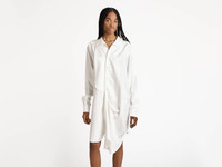 Fluid draped shirt dress in off-white silk, features a soft feminine collar and tuxedo shirt bib detailing. Finished with mother of pearl buttons. Details - Colour: Off White - Composition [Main]: 100% Silk - Made in: Portugal - Model [Wears]: Size 8, 178cm Tall - SKU: DR0512PG1934002