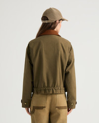 Arlequin is a cropped canvas jacket lined in plaid with a nubuck collar and a rope drawcord. - Cropped chore silhouette - Kanuk's owl logo embroidered on chest - Nubuck collar trim - Wool plaid lining - Zipper and shank button closure - Flap pockets with welt entry - Adjustable sleeve cuffs with tabs - Rope drawcord at hem Fabric details & care - Shell: Canvas in 100% cotton - Collar: Genuine nubuck - Lining: 100% cotton blend with camel wool plaid - Dry clean only - This garment features genuine nubuck leather. Due to the natural characteristics of the material, subtle variations in texture, grain, or colour may occur. These are not imperfections, but natural markings that highlight authenticity of each piece. Sizing & fit - Center back length for size small: 22" / 56 cm - Boxy fit - Model is 5'10" and wears a size S - Fits true to size
