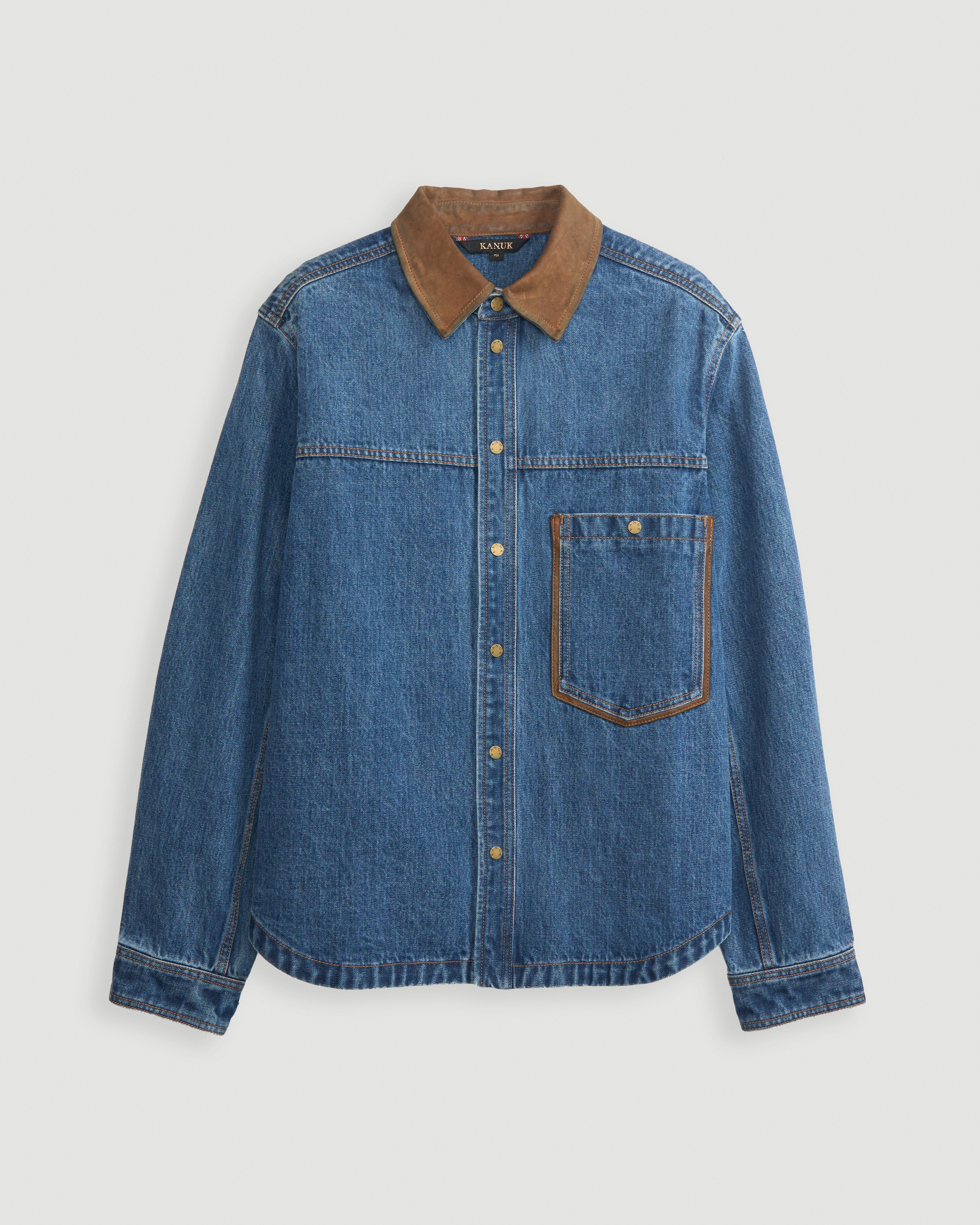 Brisebois blends denim with nubuck for a clean, utilitarian overshirt. - Nubuck-trimmed denim - Kanuk's nubuck label at the lower right back hem - Snap front closure - Single chest patch pocket - Adjustable shirt cuffs Fabric details & care - Shell: Denim in 100% cotton - Trim: Genuine nubuck - Dry clean only - This garment features genuine nubuck leather. Due to the natural characteristics of the material, subtle variations in texture, grain, or colour may occur. These are not imperfections, but natural markings that highlight authenticity of each piece. Sizing & fit - Center back length for size M: 29½" / 75 cm - Relaxed fit - Model is 6'1" and is wearing a size M - Fits true to size