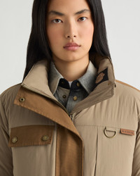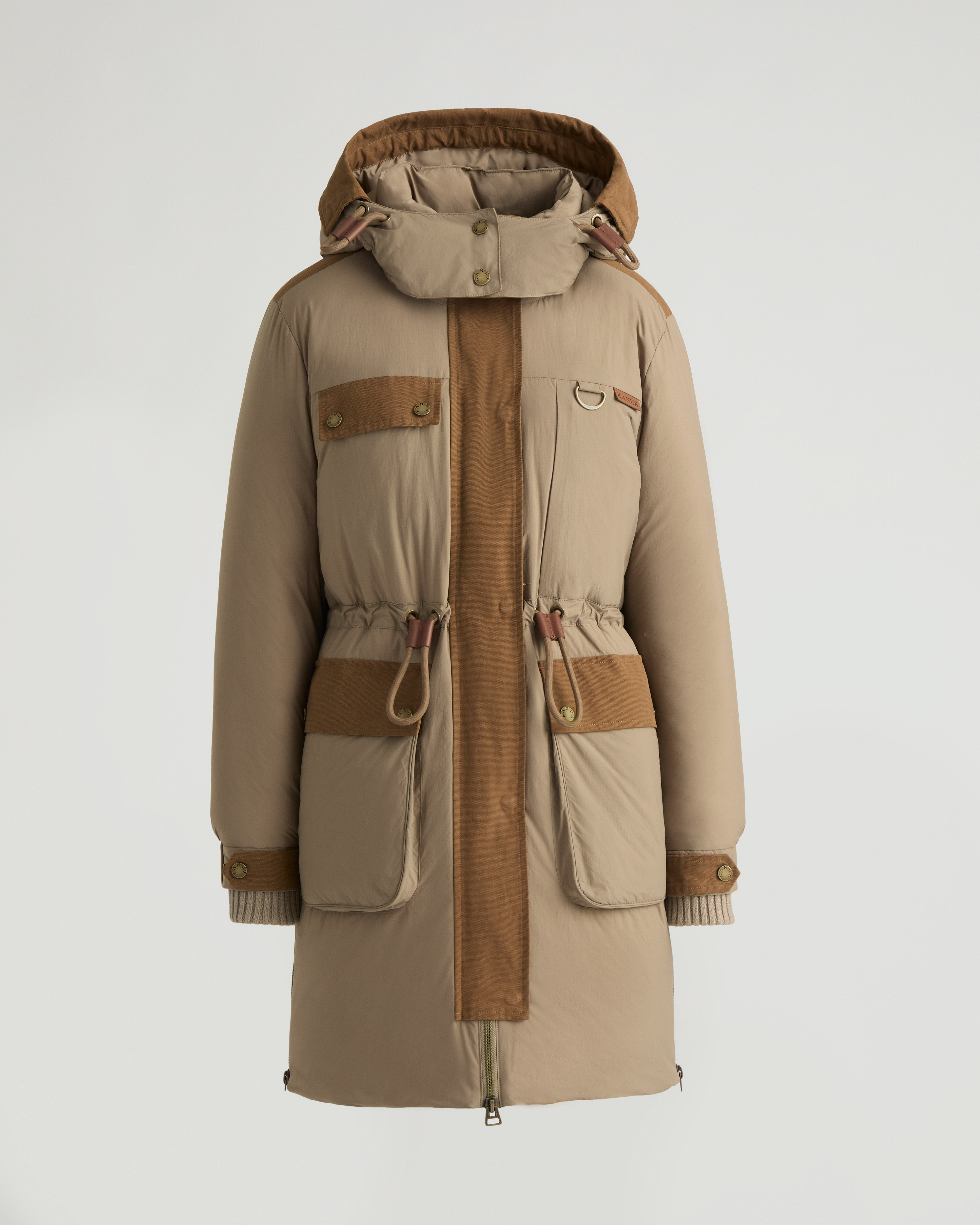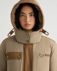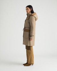Montmagny is a mixed media parka with down fill, featuring a removable hood with visor and rope drawcord at the waist. - Comfort zone: -20°C to -25°C - Down filling - Mixed media with nylon and canvas - Removable hood with visor - Double-entry patch pockets - Adjustable sleeve cuffs with tabs - Zippered side slits for ventilation - Wool-blend rib knit cuffs - Center front zipper closure - Rope drawcord at hood and waist Fabric details & care - Water-resistant - Shell: Brushed Ripstop in 100% nylon - Contrast: Canvas in 100% cotton - Lining: 100% polyester - Insulation: 90/10 RDS duck down, 800 fill power - Machine washable Sizing & fit - Center back length for size small: 38" / 97 cm - Boxy fit - Model is 5'9" and wears a size S - Fits true to size