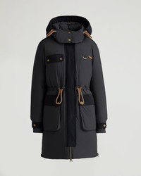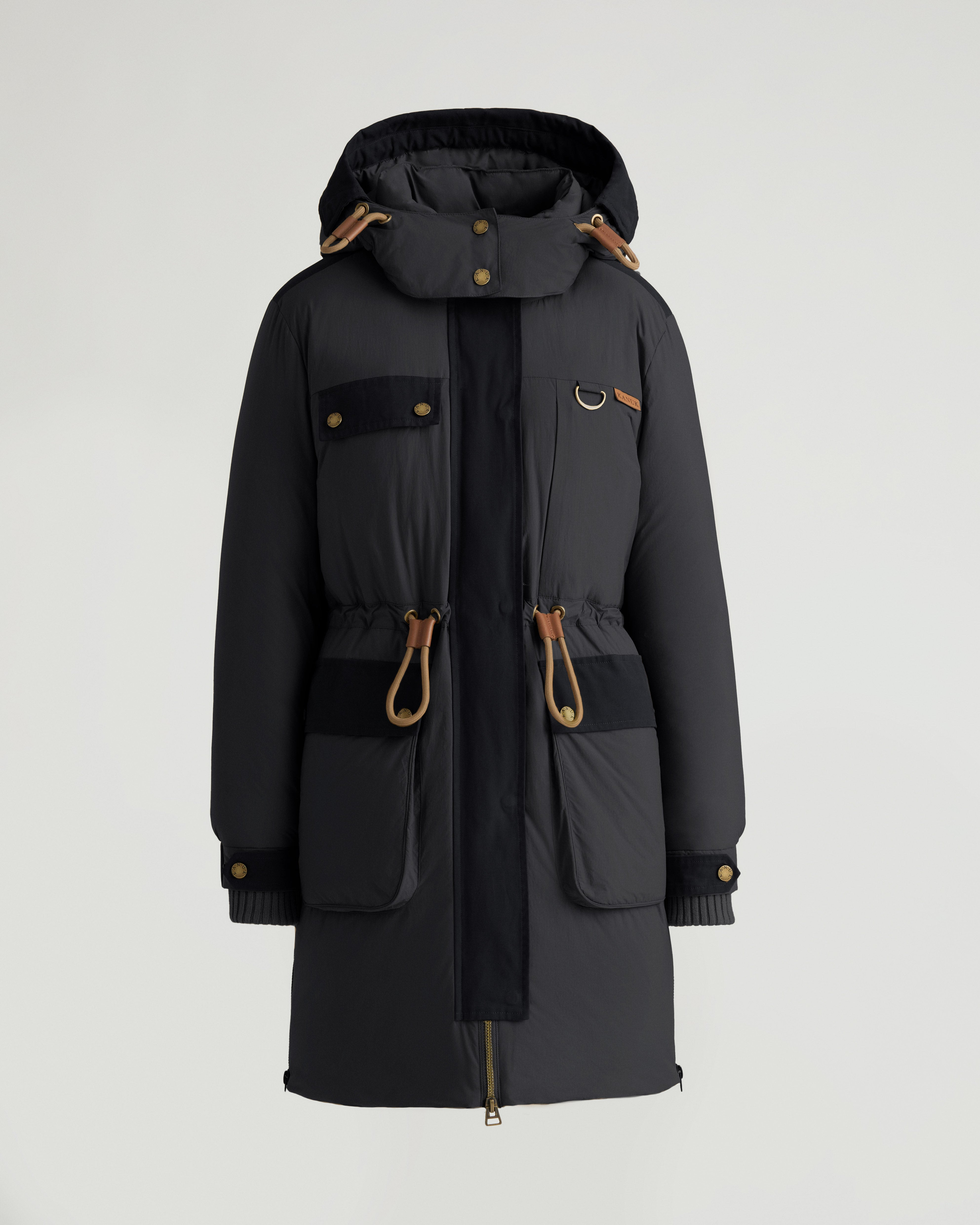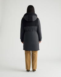 Montmagny is a mixed media parka with down fill, featuring a removable hood with visor and rope drawcord at the waist. - Comfort zone: -20°C to -25°C - Down filling - Mixed media with nylon and canvas - Removable hood with visor - Double-entry patch pockets - Adjustable sleeve cuffs with tabs - Zippered side slits for ventilation - Wool-blend rib knit cuffs - Center front zipper closure - Rope drawcord at hood and waist Fabric details & care - Water-resistant - Shell: Brushed Ripstop in 100% nylon - Contrast: Canvas in 100% cotton - Lining: 100% polyester - Insulation: 90/10 RDS duck down, 800 fill power - Machine washable Sizing & fit - Center back length for size small: 38" / 97 cm - Boxy fit - Model is 5'9" and wears a size S - Fits true to size