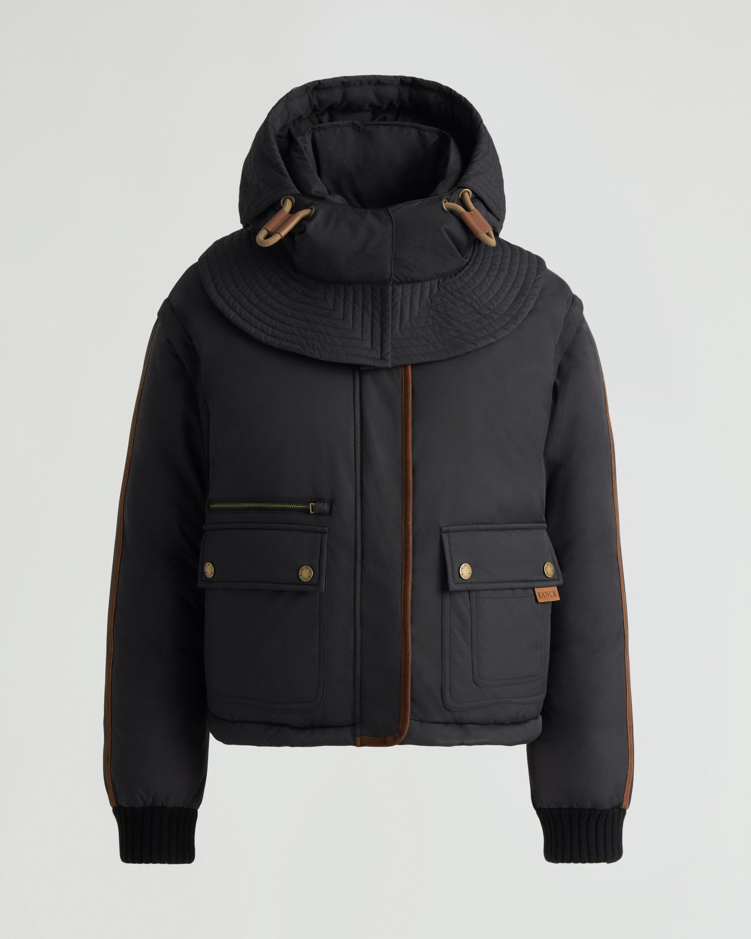 Otarie is a 2-in-1 cropped puffer designed with detachable sleeves to transform into a vest and a removable hood. - Comfort zone: 0°C to -10°C - Kanuk’s iconic logo patch on left collar - Nubuck binding - Removable hood - Removable sleeves for vest conversion - Zippered chest pocket - Side-entry patch pockets - Wool-blend rib knit cuffs - Center front zipper closure Fabric details & care - Water-resistant, windproof, breathable - Shell: Micro Twill in 100% polyester - Trim: Genuine nubuck - Rib: 100% merino wool - Lining: 100% polyester - Insulation: RDS-certified 90/10 duck down, 800 fill power - Dry-clean by leather specialist Sizing & fit - Center back length for size small: 24" / 62 cm - Relaxed fit - Model is 5'9" and wears a size S - Fits true to size