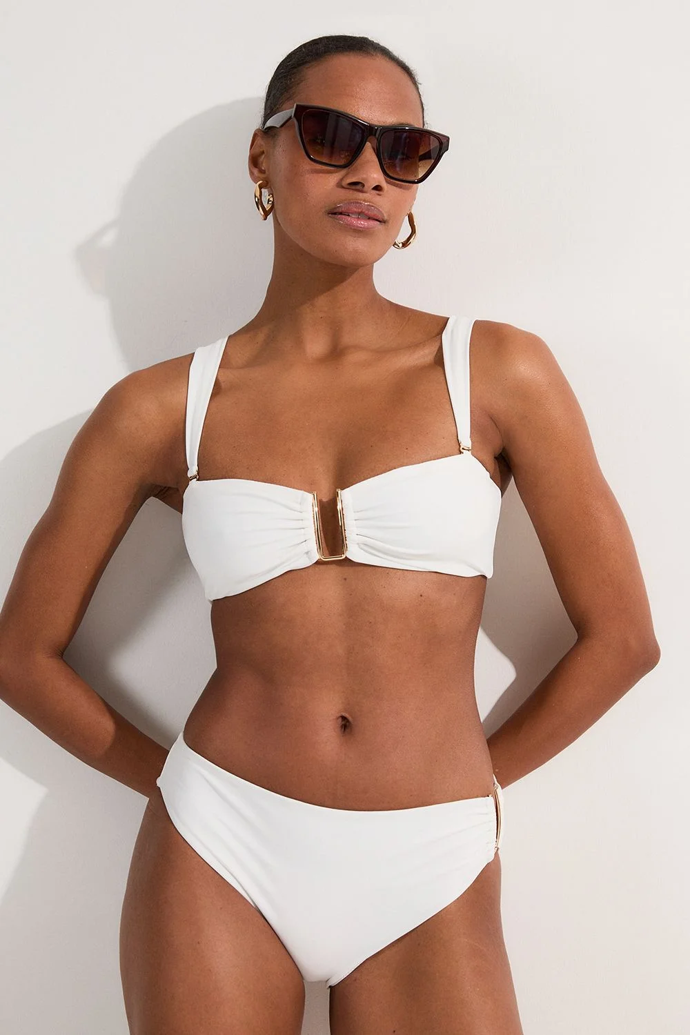 - Elegant bikini bottoms featuring distinctive gold hardware trim for a refined aesthetic - Mid-rise design offering comfortable coverage with a flattering fit - Smooth nylon-blend fabric providing excellent shape retention and comfort - Coordinating perfectly with the matching bandeau-style top for a complete ensemble - Versatile design suitable for poolside lounging or beachfront relaxation These sophisticated bikini bottoms from Karen Millen present a contemporary take on swimwear essentials. The striking gold hardware detail adds a touch of understated opulence to the clean-lined design, making these bottoms both timeless and current. The mid-rise silhouette offers just the right amount of coverage while maintaining a modern profile. Perfect for daytime coastal escapes or poolside gatherings, these bottoms can be styled with the matching top and complemented with delicate gold jewellery for a coordinated look. Add an airy linen shirt and woven sandals when transitioning from beach to casual lunch. The durable fabric composition ensures these bottoms maintain their shape throughout your holiday, while the classic design makes them a wardrobe staple for numerous summer seasons to come. Product Details & Care Main/lining: 82% Nylon, 18% Elastane/Spandex. Cool hand wash separately. Do not bleach. Do not tumble dry. Do not dry clean. Line dry. Model wears a UK size Small. Models height approx: 5"9.