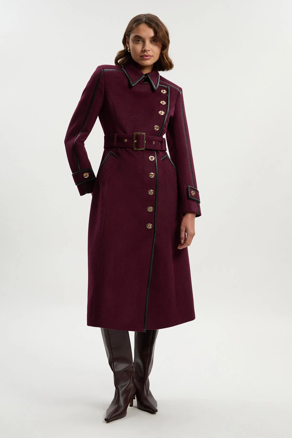 Brushed Wool Pu Mix Gold Trim Belted Midi Coat