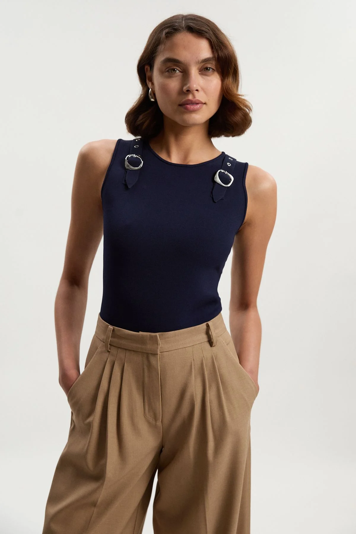 This Karen Millen buckle trim knitted top combines contemporary design with everyday wearability. The distinctive metallic buckle details at the shoulders add a modern edge to this otherwise classic piece, creating a subtle statement that works for daytime occasions. This top transitions effortlessly from casual weekend plans to office settings, offering the perfect balance of comfort and polish that the Karen Millen woman appreciates in her carefully curated wardrobe. Sleek knitted top Classic crew neckline Sleeveless design Crafted from a soft, stretchy knitted fabric Product Details & Care Main: 55% Viscose/Rayon, 43% Polyamide, 2% Elastane/Spandex. Wash with similar colours. Do not tumble dry. Model wears UK size Small. Models height approx 5"9. Length approx 54cm.