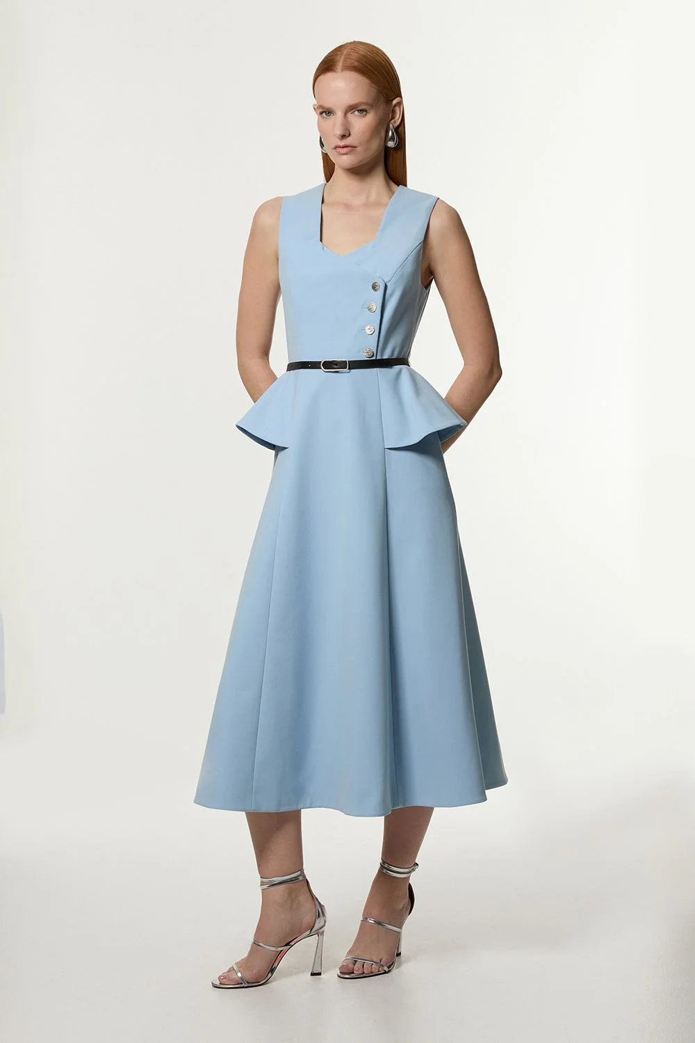 Feel formal in our midi dress, with a classic, flared design and a peplum style waist. Style this dress with strappy heels or heeled boots for an outfit that will turn heads from wedding guest days to special occasions. Compact Stretch Belted Peplum Detail Full Midi Dress High Quality Stretch Fabric Unique, Geometric Neckline Flattering Fit and Flare Silhouette Belted Waistline Button Accents at Bodice Peplum Detailing at Waist Product Details & Care Main 62% Polyester, 34% Viscose/Rayon, 4% Elastane/Spandex. Lining 100% Polyester. Dry clean only. Model height 5"9. Model wears size 10. Item length 125cm