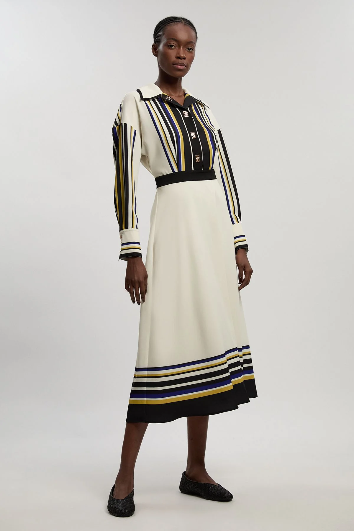 - Striking contrast stripe pattern on bodice and hem creates visual interest - Classic shirt dress silhouette with crisp collar and button-through front - Defined waistband accentuates the feminine shape - Elegant maxi length with a flowing A-line skirt - Long sleeves with neat cuffs for a refined finish This twill woven maxi shirt dress combines contemporary design with timeless sophistication. The contrast stripe detailing on the bodice and hem creates a harmonious balance, while the defined waistband cinches the silhouette for a flattering effect. Style with ballet flats for daytime appointments or switch to heeled ankle boots for evening engagements. The versatile design transitions effortlessly from office to dinner, making it an essential addition to your capsule wardrobe. For cooler days, layer with a tailored blazer or lightweight trench coat. This Karen Millen piece embodies refined craftsmanship with its precise tailoring and attention to detail, perfect for the woman who appreciates contemporary elegance with a distinctive edge. Product Details & Care Main: 100% Polyester, wash dark colours separately, iron on reverse, Model wears UK 8/US 4. Model Height 5"9. Length approx: 135cm