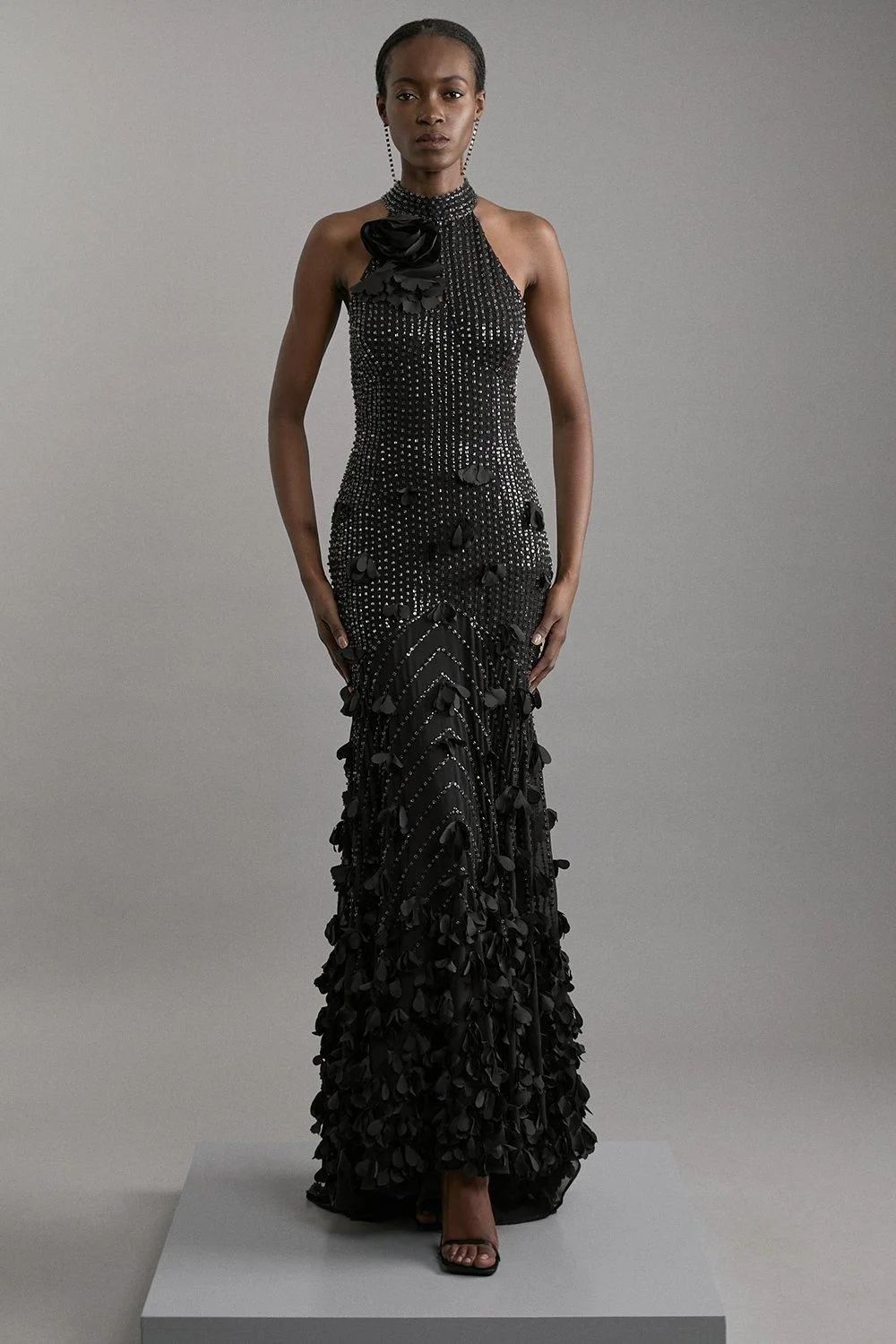 - Stunning halterneck maxi dress adorned with crystal applique detailing for a touch of glamour - Elegant rosette embellishment at the neckline creates a sophisticated focal point - Dramatic tiered ruffle detailing cascades down the skirt for a show-stopping silhouette - Figure-enhancing woven fabric with a fully lined construction for comfort and structure - Floor-sweeping length with a graceful fishtail hem that adds movement with every step Make an unforgettable entrance in this breathtaking Crystal Applique Woven Maxi Dress from Karen Millen. The sophisticated halterneck design frames the decolletage beautifully, whilst the sparkling crystal embellishments catch the light with every movement. The dress transitions from a structured bodice to a dramatically tiered skirt with rosette detailing, creating a silhouette that commands attention. Perfect for black-tie events, evening galas or as a show-stopping wedding guest ensemble, this dress requires minimal accessorising - simply pair with refined strappy heels and delicate drop earrings as shown. For cooler evenings, drape a lightweight pashmina over your shoulders or add a tailored evening jacket. The meticulous craftsmanship of this piece reflects Karen Millen's dedication to creating contemporary yet timeless occasion wear that celebrates feminine elegance. Product Details & Care Shell: 100% Polyester. Lining: 95% Polyester 5% Elastane/Spandex. Trim: 100% Polyester. Hand wash separately in cool water using non-biological liquid detergent. Do not dry clean. Model Height 5''10 - Model wears a UK 8/US Size 6. Centre back length of a 8: 155cm