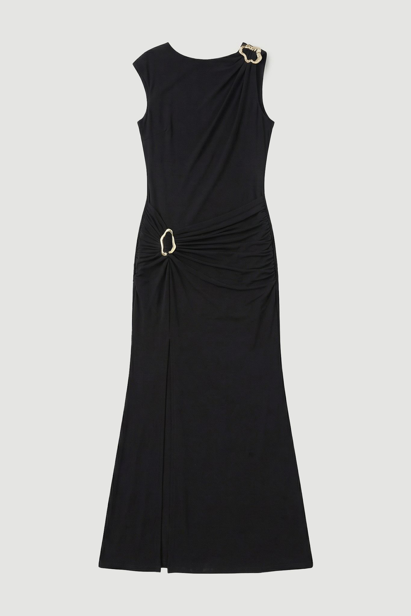 - Elegant round neck maxi dress with sophisticated drapey crepe fabric - Striking gold-tone hardware detail at shoulder and waist for contemporary appeal - Flattering ruched detailing that creates a sculpted silhouette - Dramatic side split design offering effortless movement - Sleeveless cut perfect for showcasing statement jewellery This Karen Millen drapey maxi dress combines sophisticated simplicity with thoughtful details that showcase expert craftsmanship. The ruched detailing creates a flattering silhouette that gently contours the body, while the side split adds a touch of drama to this daywear piece. Style with minimal gold-tone accessories to complement the hardware detailing, as shown with the model's elegant bracelet and earrings. Perfect for family gatherings or special brunches, this versatile dress transitions beautifully from day to evening with a simple change of accessories. Pair with strappy sandals for a casual daytime look, or dress up with block heels and a structured clutch for dinner dates. The sleek silhouette works wonderfully with a tailored denim jacket for cooler days, creating a balanced contrast between casual and refined elements. Product Details & Care Main: 95% Polyester, 5% Elastane/Spandex, Lining: 95% Polyester, 5% Elastane/Spandex, wash inside out, Model wears UK Small. Model Height 5"9.