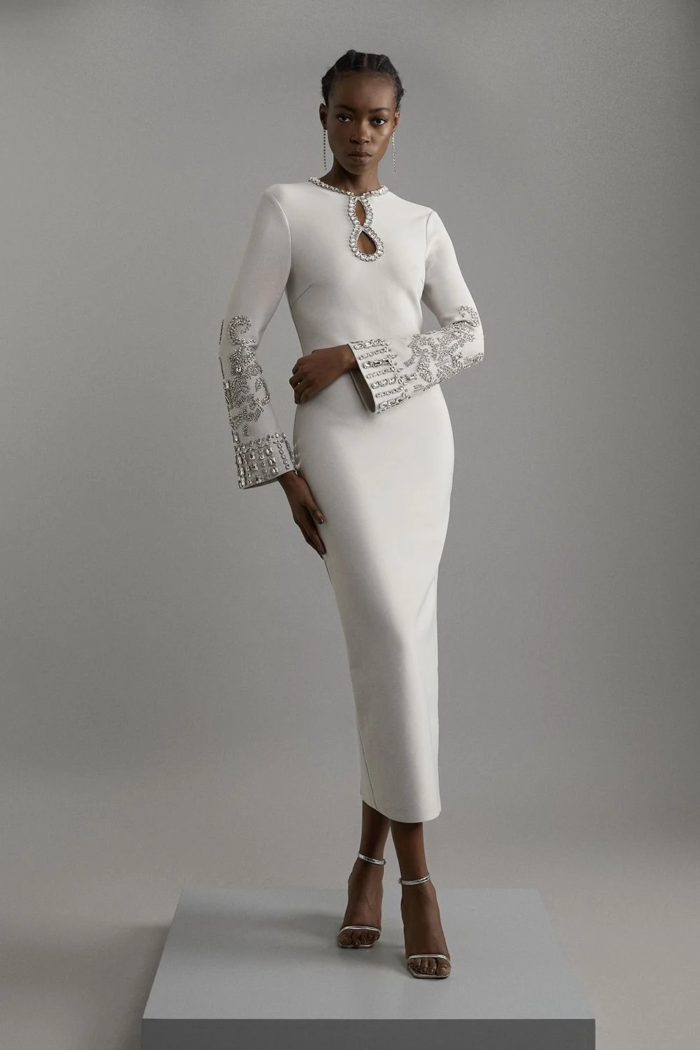 Add some sparkle in our embellished dress, with sparkling crystal detailing that highlights the cut out neckline and wide sleeves. Style this piece with strappy heels for an outfit that goes seamlessly from party nights to festive evenings. Figure Form Bandage Knit Embellished Wide Sleeve Midaxi Dress High Quality Knit Fabric Statement Crystal Embellished Detailing Unique Keyhole Neckline Flattering, Figure Hugging Fit Embellished Detailing at Cuffs Unique Wide Sleeves Thigh High Leg Split in Back Zip Fastenings in Back Product Details & Care Main: 97% Recycled Polyester, 3% Elastane. Cool hand wash only. Model wears a Small. Models height is 5"7. Centre back length is 140cm.