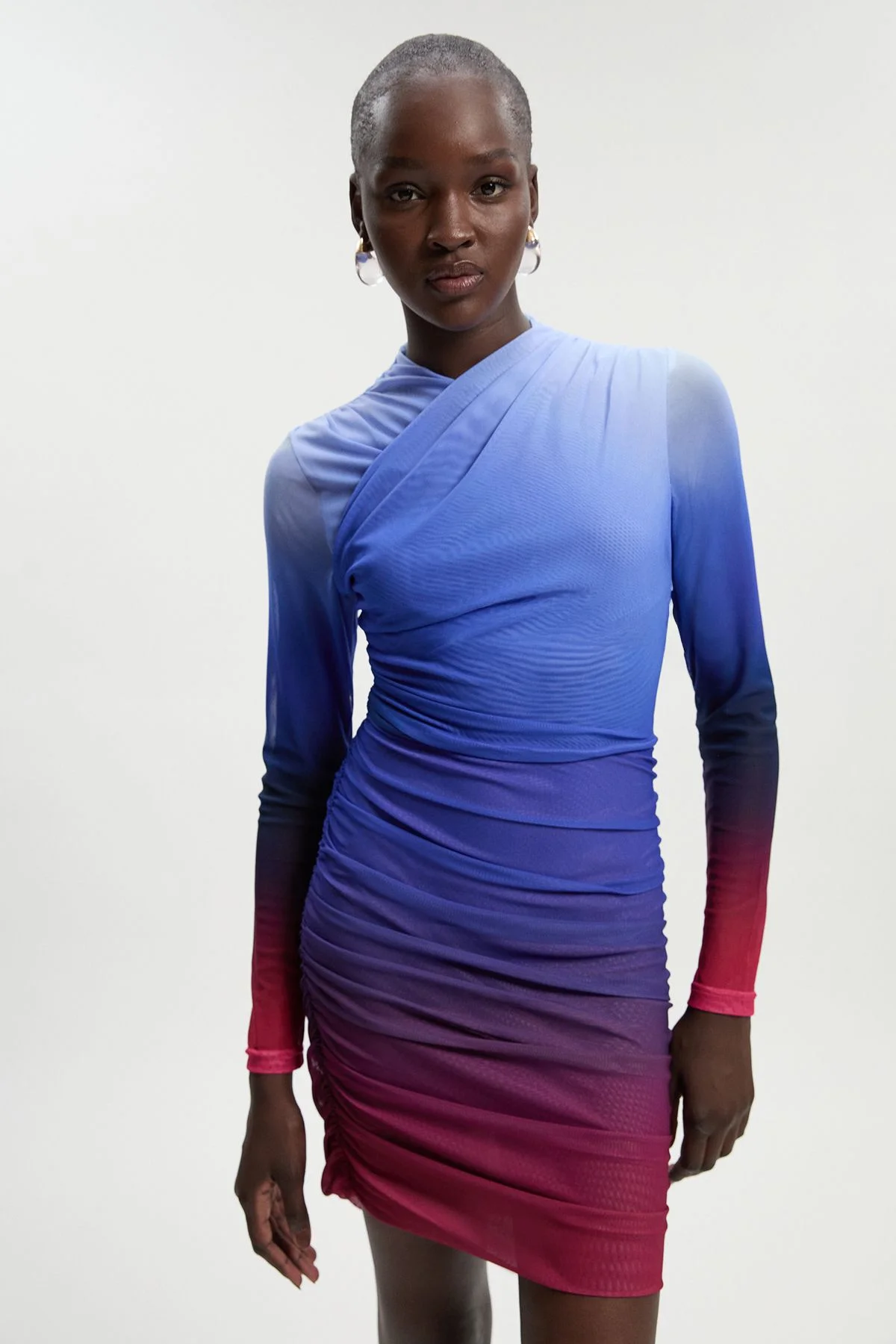 Ombre Printed Mesh Ruched Mini Dress