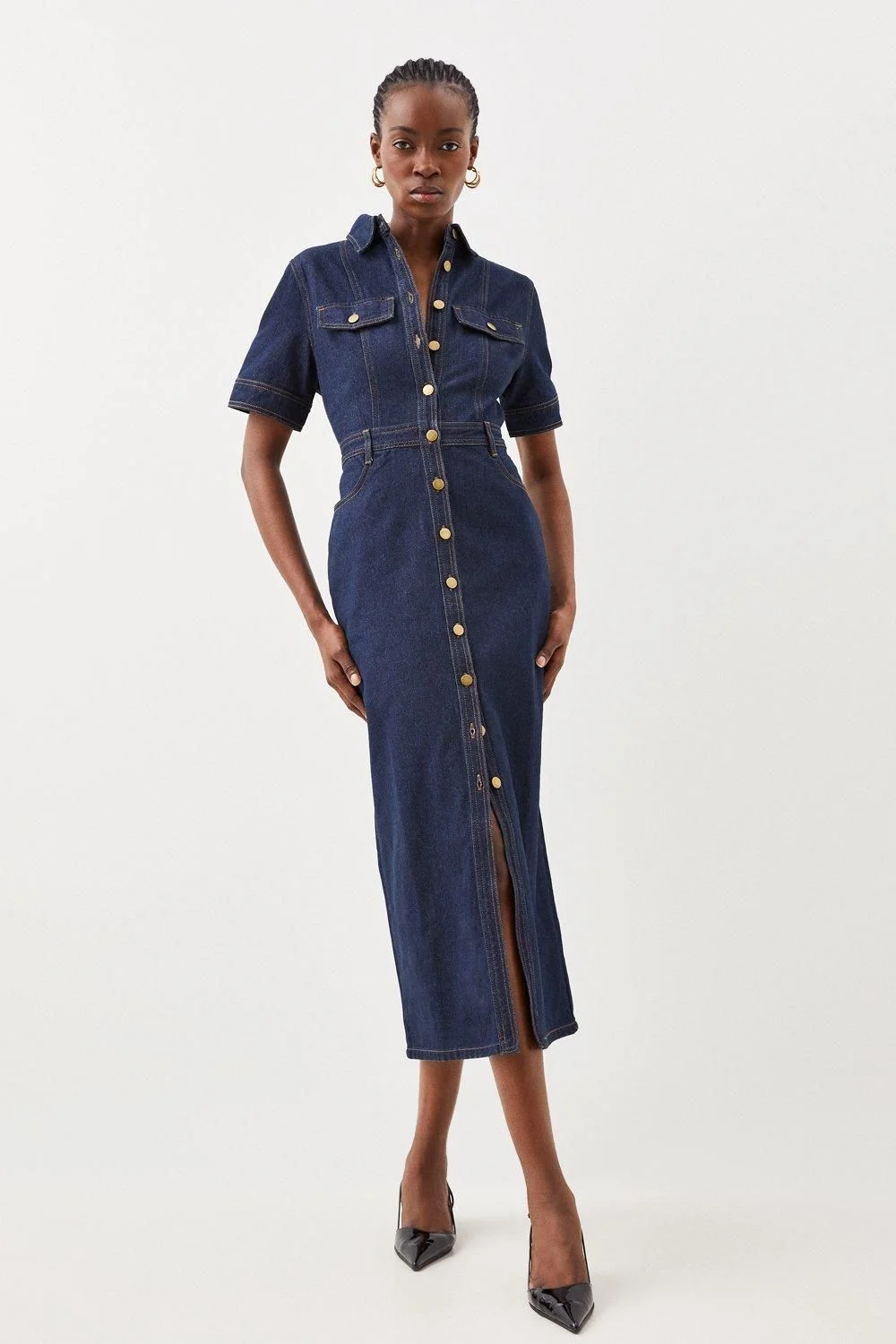Bring a style statement to casual occasions with this maxi shirt dress, crafted from premium denim fabric with a button-down design and short sleeves for practicality, while pocket flaps, a front split hem and belt loops add elevated details.Maxi hemlineDenim fabricShort sleevesButton detailingExpertly designed for those 5'3" and under, our Petite pieces are perfectly proportioned for a smaller frame using shorter lengths. Product Details & Care Main: 85% Cotton, 10% Rayon, 5% Polyester. Wash with similar colours. Due to the nature of the dying process there may be some colour transfer onto garments and upholstery. Model wears UK 8/US 4. Item length 129cm