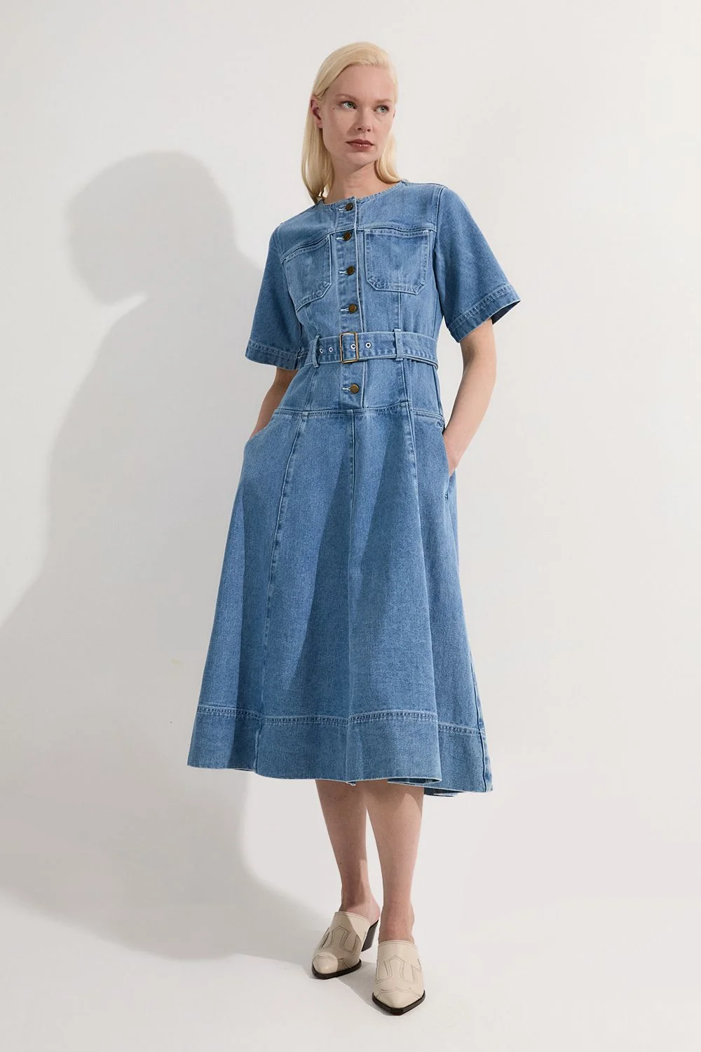 This Karen Millen denim midi dress is a versatile piece that effortlessly bridges the gap between casual and smart-casual attire. The soft wash finish lends a lived-in comfort to the structured denim fabric, making it perfect for all-day wear. Style it with white trainers and a crossbody bag for a relaxed weekend look, or dress it up with ankle boots and statement earrings for a casual dinner date. The belted waist allows you to customise the fit, accentuating your figure, while the A-line skirt provides a feminine touch. This dress is ideal for various occasions, from family gatherings to casual Fridays at the office. Its timeless design ensures it will remain a staple in your wardrobe for seasons to come. Denim midi dress with a soft wash finish Short sleeves and round neckline for a classic look Button-down front with functional chest pockets Matching belt to cinch the waist for a flattering silhouette A-line skirt with a subtle flare for easy movement Product Details & Care 59% Cotton. 23% Viscose/Rayon. 18% Polyester. Wash before wear to reduce the possibility of colour transfer. The dye gradually dispenses through washing, giving the garment a distinctive worn effect. Avoid contact with light colours when wet as colour may transfer. Wash inside out. Iron on reverse. Due to the nature of the dyeing process there may be some colour transfer onto garments and upholstery. Model wears UK Size 8/ US Size 4. Model height approx: 5"9. Length approx: 119cm