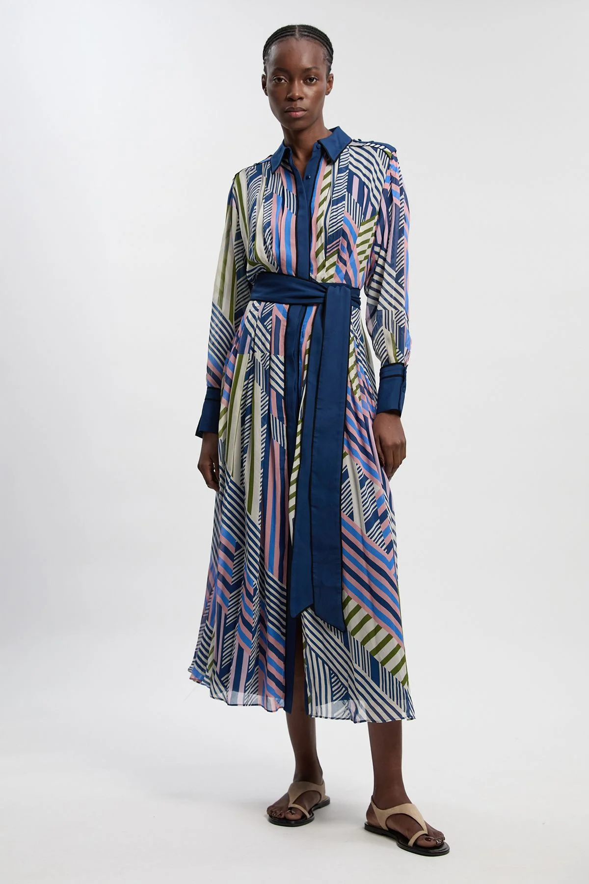 - Striking geometric print maxi shirt dress with contrasting solid cuffs and collar - Flowing viscose georgette fabric creates elegant movement with every step - Sophisticated button-through design with coordinating waist tie for a defined silhouette - Midi-length hem offers versatile styling options for various occasions - Long sleeves with smart cuffs provide year-round wearability This captivating geo printed maxi shirt dress embodies contemporary sophistication with its artistic pattern and refined silhouette. The lightweight viscose georgette fabric drapes beautifully, creating a fluid effect that moves gracefully as you walk. The contrasting solid collar and cuffs add structure to the flowing design, whilst the coordinating waist tie allows you to customise the fit to your preference. Style with minimal flat sandals for an effortless daytime look, or transform for evening events with sleek heeled mules and statement earrings. For cooler weather, layer with a tailored blazer and ankle boots. This versatile piece transitions seamlessly from gallery openings to garden parties, embodying the Karen Millen ethos of polished yet contemporary design that celebrates expert craftsmanship and attention to detail. Product Details & Care Main: 100% polyester. Machine wash only. Remove detachable belt before cleaning. Model wears Size UK 10/US Size 6. Model's height approx. 5'9". Length approx. 130cm