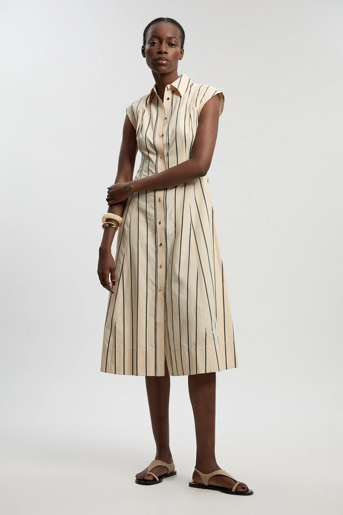 - Crafted in cotton woven fabric with distinctive stripe pattern and contrast top stitching - Classic collared neckline with full button-through front design - Elegant cap sleeves for refined warm-weather styling - Midi length silhouette with A-line shape for flattering proportions - Structured design with clean lines that highlight expert craftsmanship This Karen Millen shirt dress embodies sophisticated simplicity with its structured woven fabric and considered details. The vertical stripe pattern creates a lengthening effect, while the button-through design offers versatile styling options. Pair with flat sandals as shown for an effortless daytime look, or transform for evening with strappy heels and statement jewellery. The midi length and A-line cut make this piece particularly suitable for garden parties, gallery visits or refined lunch engagements. The collared neckline adds a touch of tailored polish that works beautifully with minimal accessories. This dress transitions seamlessly between seasons-layer with a fine knit cardigan and ankle boots when temperatures drop, or wear alone with espadrilles for warm summer days. A truly versatile addition to any considered wardrobe. Product Details & Care 45% Cotton, 45% Polyester, 10% Polyamide, wash with similar colours, wash inside out, iron on reverse, Model wears UK 8/US 4.