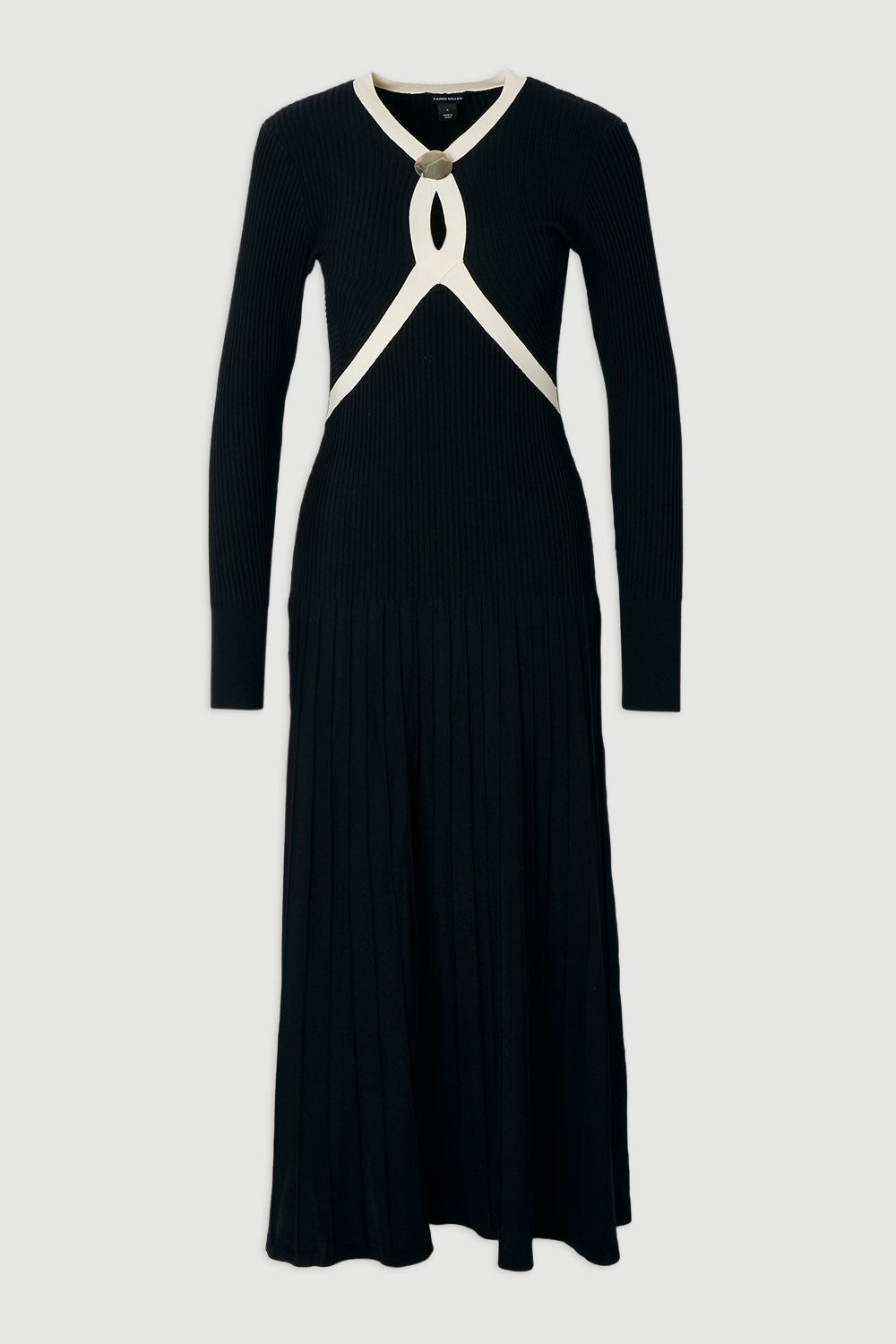 - Elegant V-neckline enhanced with contrasting trim detail for a sophisticated touch - Flattering ribbed knit construction that gently contours the figure - Full skirt design with pleated detailing for graceful movement - Long sleeves offer versatility for transitional weather - Midi length perfect for petite frames, hitting at the ideal point for proportion This Karen Millen ribbed midi dress combines contemporary design with timeless elegance. The striking contrast trim creates a distinctive visual interest across the bodice, whilst the full skirt offers a beautiful silhouette that moves gracefully with every step. Style with pointed ankle boots as shown for a chic daytime look that works beautifully for family gatherings or weekend brunches. For a more casual approach, pair with white trainers and a crossbody bag for effortless sophistication. The versatile midi length makes this piece particularly flattering for petite frames, creating a balanced proportion that doesn't overwhelm. Perfect for those moments when you want to feel polished yet comfortable, this dress showcases Karen Millen's commitment to expert craftsmanship and contemporary design. Product Details & Care Main: 53% Polyamide, 47% Viscose. Machine wash. Due to the delicate nature of this fabric, care must be taken with jewellery and rough surfaces. Models wears UK size Petite Small. Models height approx: 5"3. Length approx 114cm.