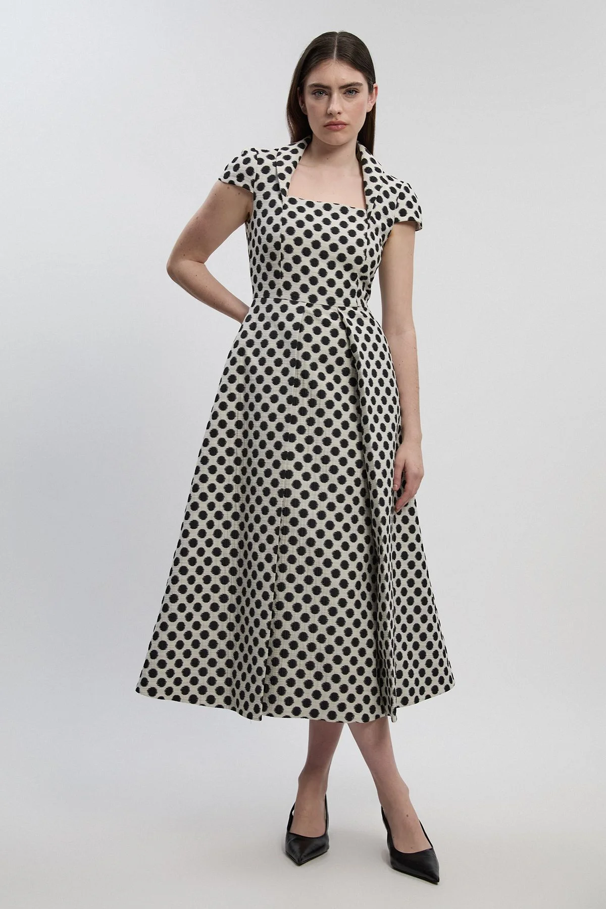 Spot Jacquard Square Neck Tailored Full Skirted Midi Dress