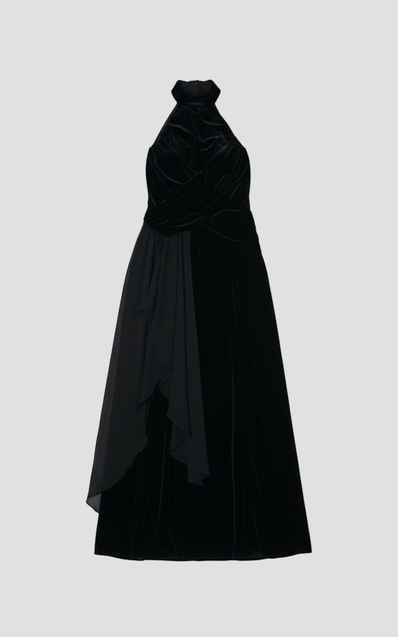 - Sumptuous velvet bodice with elegant cross-front halterneck design - Dramatic woven fabric overlay creates a striking asymmetric drape - Floor-sweeping maxi length perfect for petite frames - Sophisticated front split detail adds movement and allure - Fully lined for comfort and a flawless silhouette This Karen Millen Petite Velvet Cross Front Woven Maxi Dress embodies sophisticated glamour with its luxurious textural contrast. The halterneck design frames the decolletage beautifully whilst the cross-front bodice creates a flattering silhouette. The flowing woven overlay adds dramatic movement as you walk, with the front split offering both practicality and elegance. Perfect for formal occasions, this dress pairs exquisitely with pointed court shoes as shown and minimal jewellery to let the dress command attention. Add a structured clutch and a sleek updo for weddings or black-tie events. The maxi length has been specially proportioned for petite frames, ensuring the perfect fit without overwhelming your silhouette. This versatile piece transitions effortlessly from winter galas to summer evening soirees, making it a timeless addition to your occasion wardrobe. Product Details & Care Main: 1 100% Polyester, Main: 2 100% Polyester, Lining: 100% Polyester, Wash with similar colours, Turn inside out and place in a mesh laundry bag, Do not tumble dry, Do not bleach, Iron on reverse, Model wears UK 8/US 4. Length Approx: 128cm
