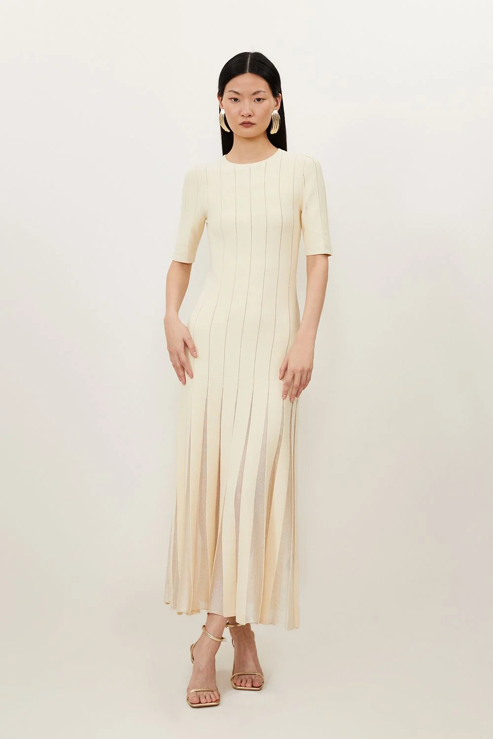 - Elegant knitted midi dress with sophisticated vertical ribbing detail - Flattering crew neckline and short sleeves for versatile seasonal wear - Beautifully structured full skirt with pleated panels for graceful movement - Viscose blend fabric offering comfortable stretch and excellent drape - Designed specifically for petite frames with proportionate 120cm length This Karen Millen knitted midi dress exemplifies refined daywear with its contemporary silhouette and expert craftsmanship. The vertical ribbing creates a slimming effect while the full skirt adds elegant movement with every step. Style with strappy heeled sandals as shown for casual gatherings, or transform with ballet flats and a structured blazer for family luncheons. The viscose blend construction ensures the dress maintains its shape throughout the day whilst providing comfort and breathability. For cooler weather, layer with a cropped cardigan and add ankle boots for a sophisticated autumn ensemble. This versatile piece transitions effortlessly from office to weekend, making it an essential addition to your capsule wardrobe that reflects the polished aesthetic Karen Millen is renowned for. Product Details & Care 55% Viscose 43% Polyamide 2% Elastane. Wash with similar colours. Model wears UK Petite Small. Small centre back length approx: 120cm